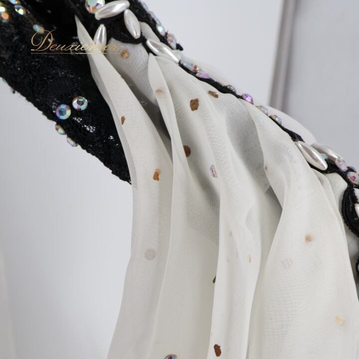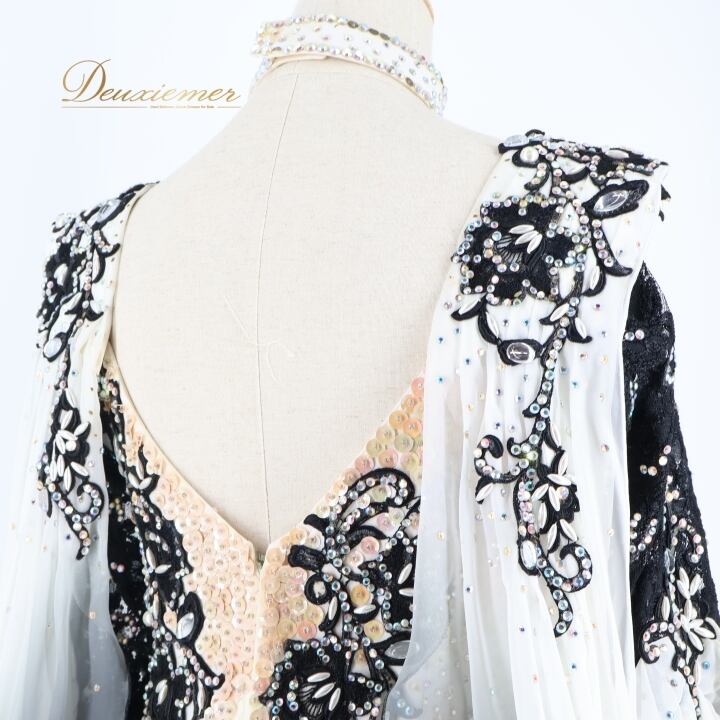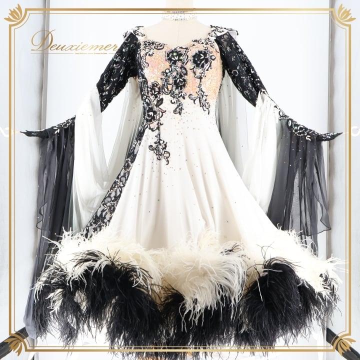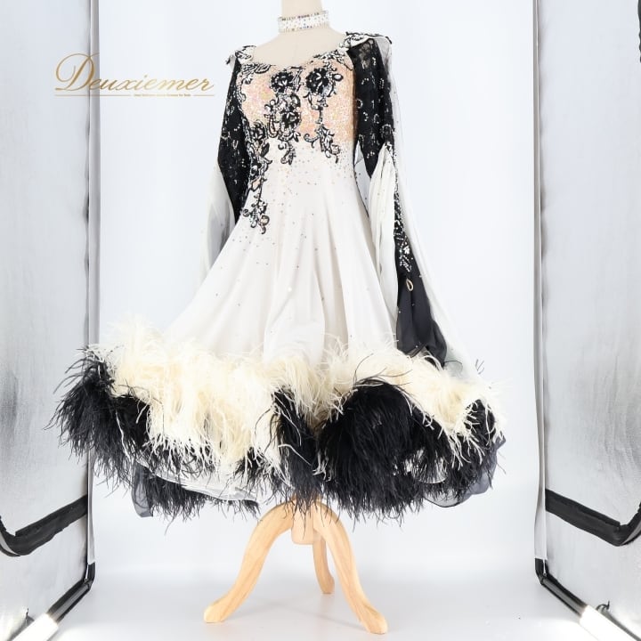 社交ダンス 衣装 スタンダード ドレス スタンダードドレス ワンピース フロート デモ 競技 ダンス パーティ 発表会 白 黒 ファー 羽 ブラック系 ホワイト系 ゴージャス お洒落 ゆったり 大人用 イベント用 高級感 ステージ用 レディースドレス 競技用