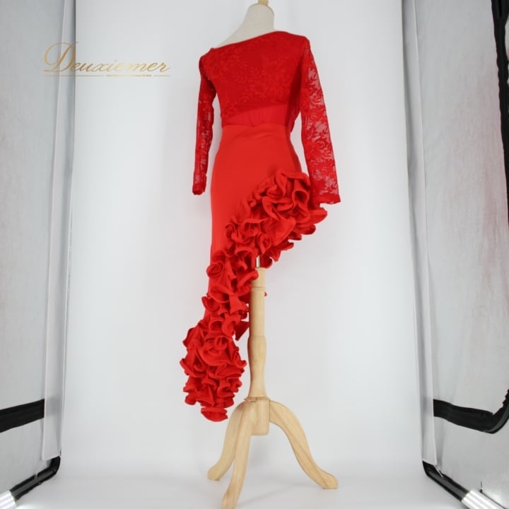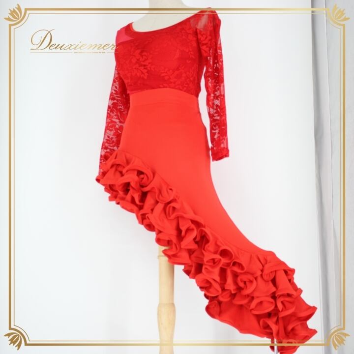 社交ダンス 衣装 ラテン 上下セット ツーピース パーティ衣装 レディース オールシーズン 赤 Dressy Story レッド系 フリル アシメ フルスカート ストレッチ フェミニン モダン 着心地良い アシメトリー 記念日 おしゃれ 高級感 複数サイズ 体型カバー ダンスパフォーマンス デザイン性 イベント用 パーティーウエア
