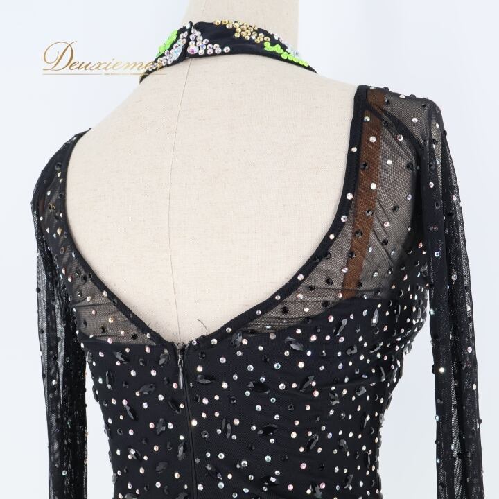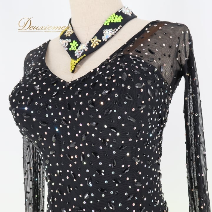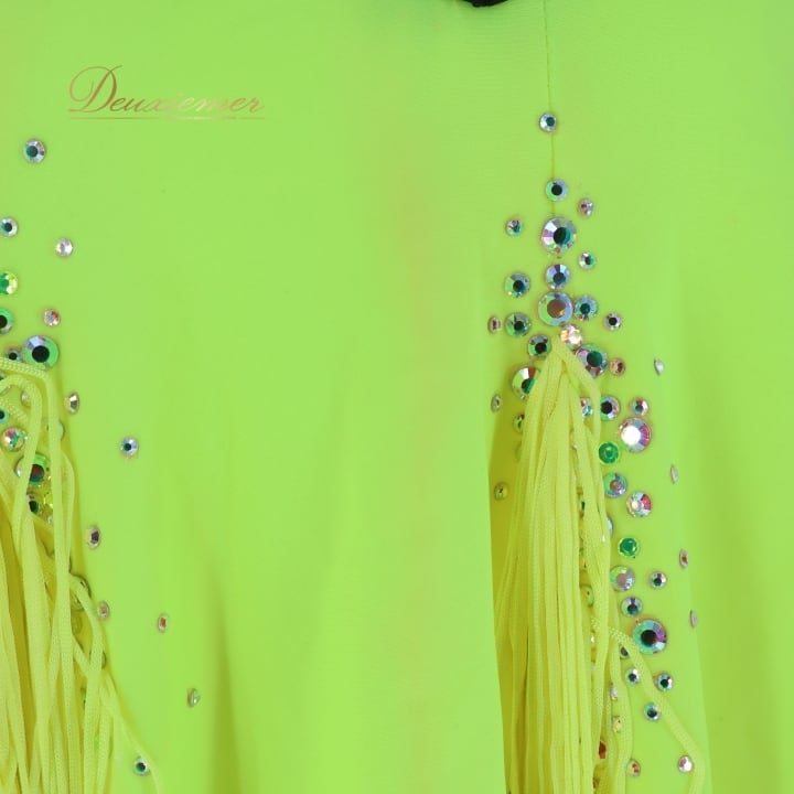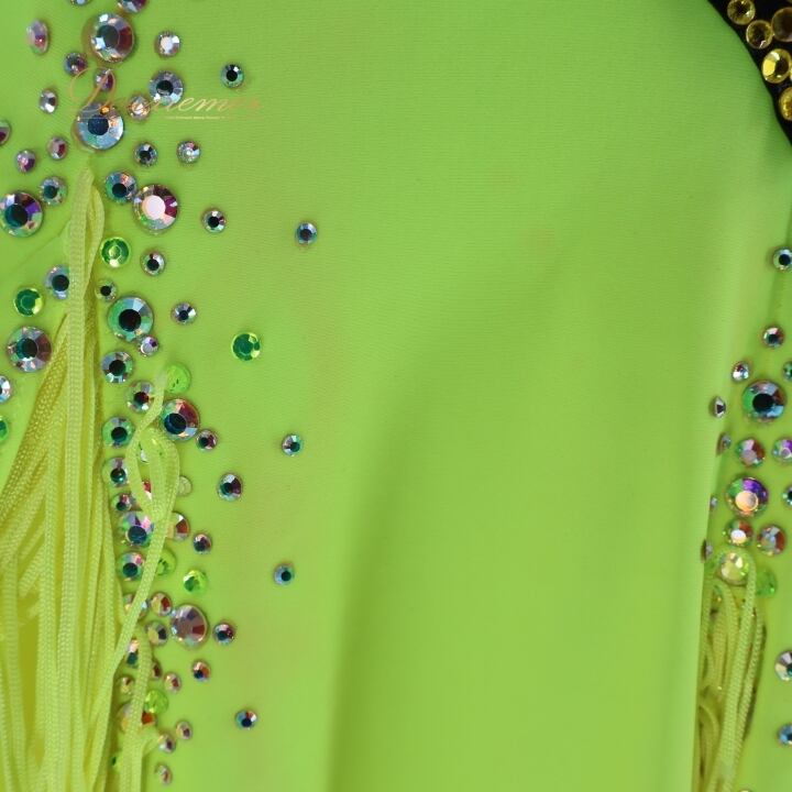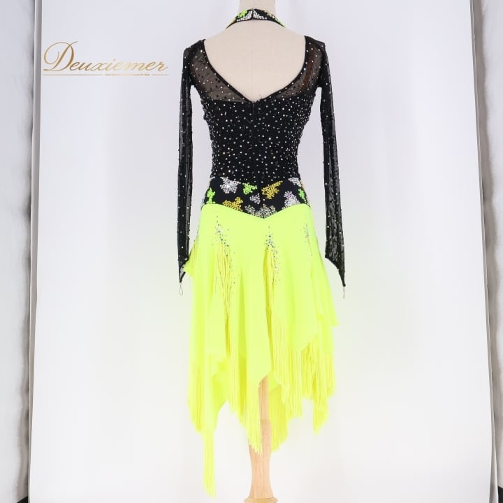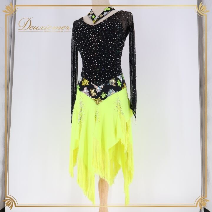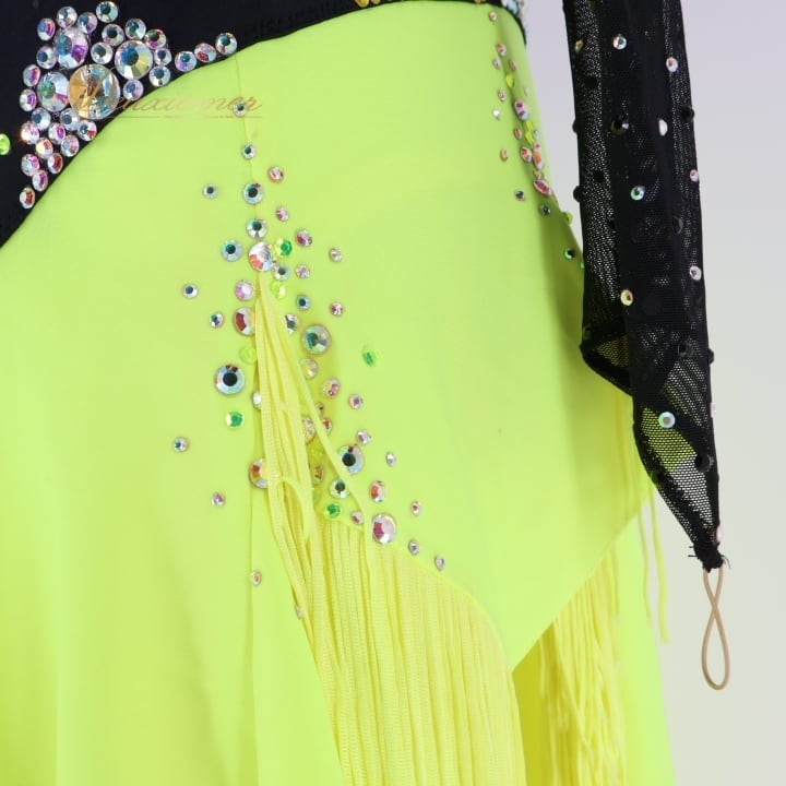 社交ダンス 衣装 ラテン ドレス ワンピース ラテンドレス 蛍光 フリンジ デモ 競技 ダンス パーティ 発表会 ブラック系 イエロー系 グリーン系 黒 黄緑 黄色 フロア映え 動き出る ドレス 揺れ 裾 蛍光色