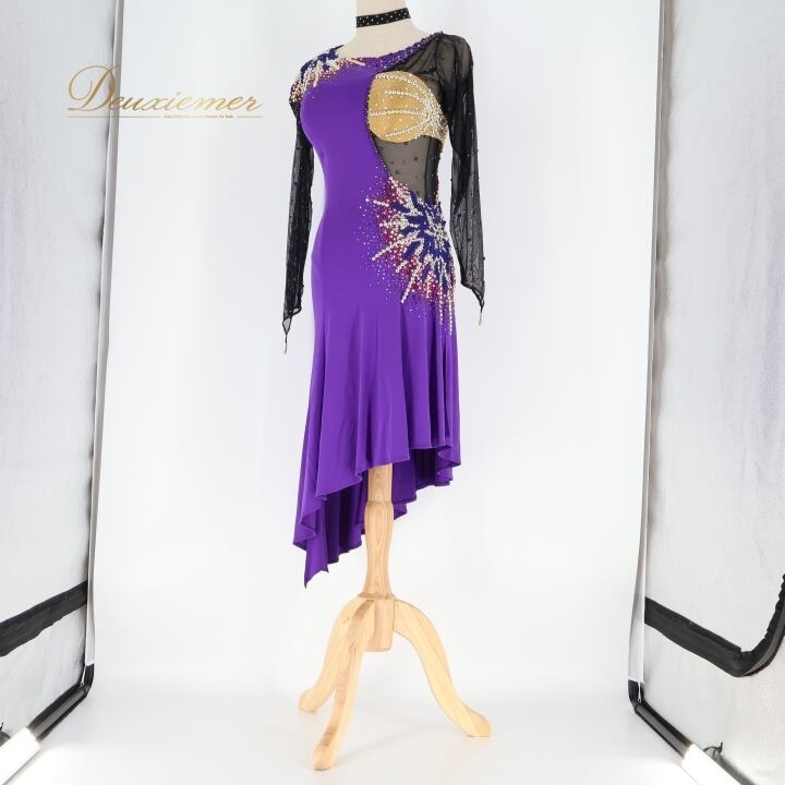 社交ダンス 衣装 ラテン ドレス ワンピース ラテンドレス 紫 ゴールド 長袖 パープル系 デモ 競技 フェスティバル 豪華 おしゃれ ショート丈 競技用 ダンスパフォーマンス 発表会 パーティ ステージ 衣装 演出用 ストレッチ シンプル