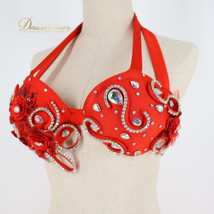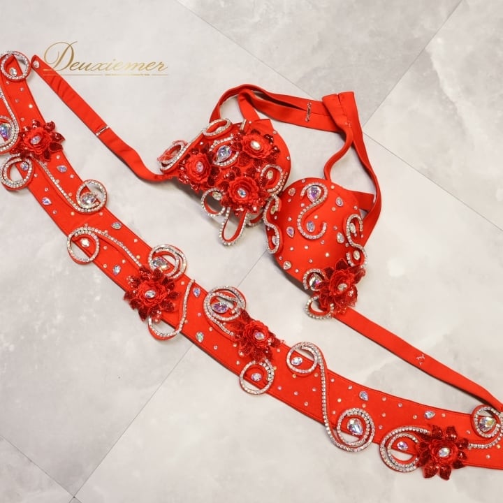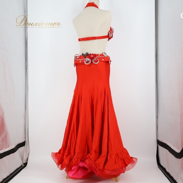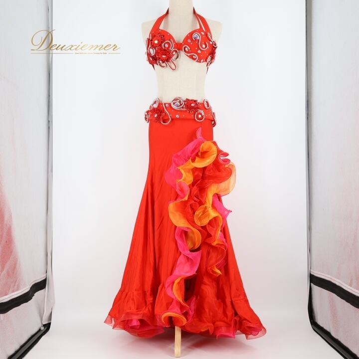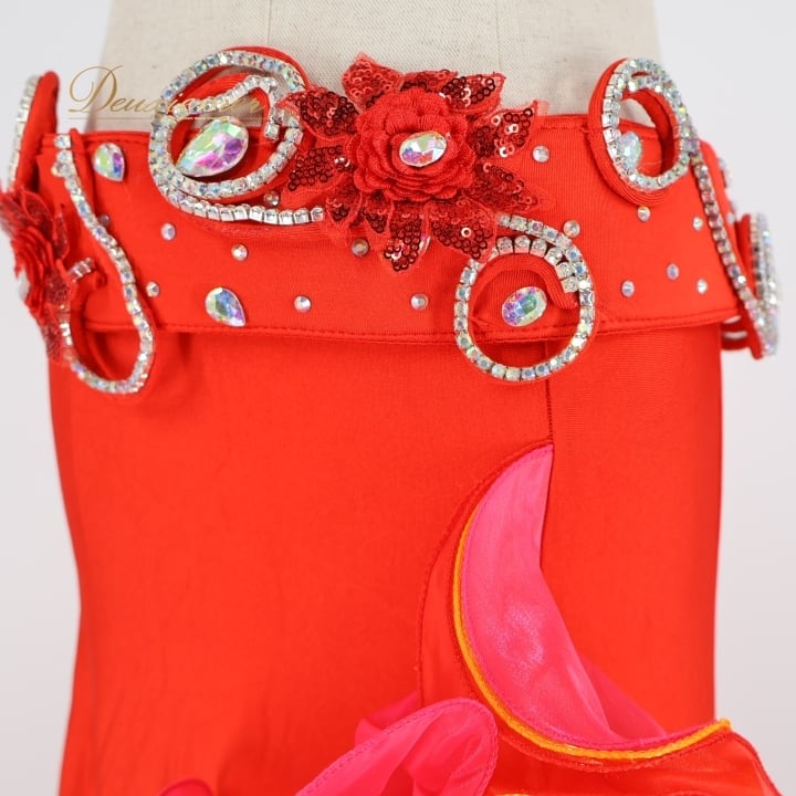 ベリーダンス オリエンタル 衣装 上下セット レッド系 花 スパンコール ビーズ フリル トップス スカート ベルト 花 煌びやか スリット 装飾 豪華 華やか 上品 ダンス衣装 舞台 ボリューム キラキラ ゴージャス 赤 オレンジ系 ピンク系