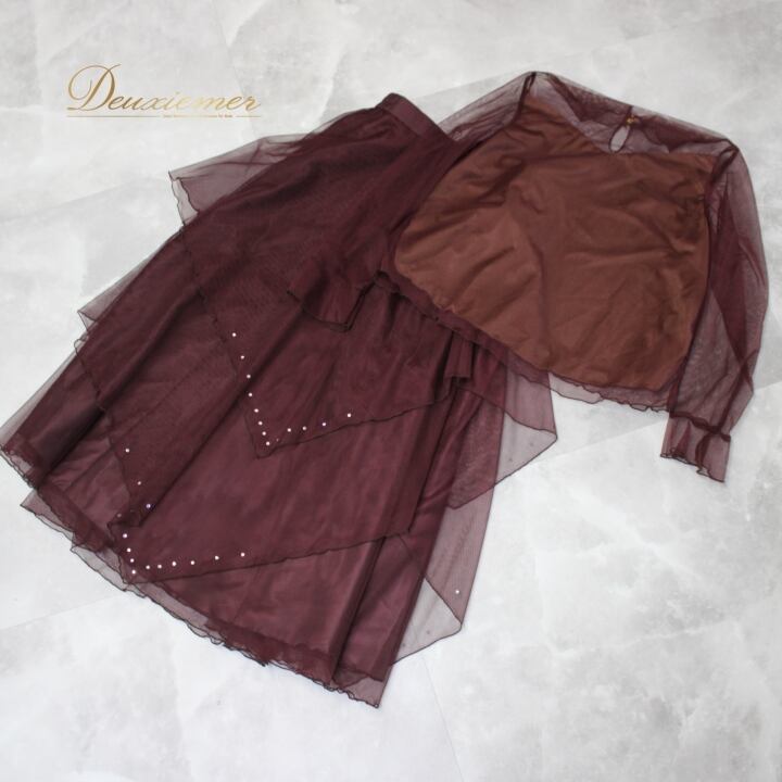 社交ダンス 衣装 スタンダード 上下セット ツーピース レッスンウェア パーティ衣装 女性用 オールシーズン U:NA ユーナ バーガンディ ブラウン系 ダンスウェア トップス スカート 軽やか レース素材 ラインストーン パーティー フォーマル Mサイズ おしゃれ 伸縮性 お祝い用 おすすめ コーディネート