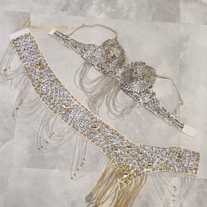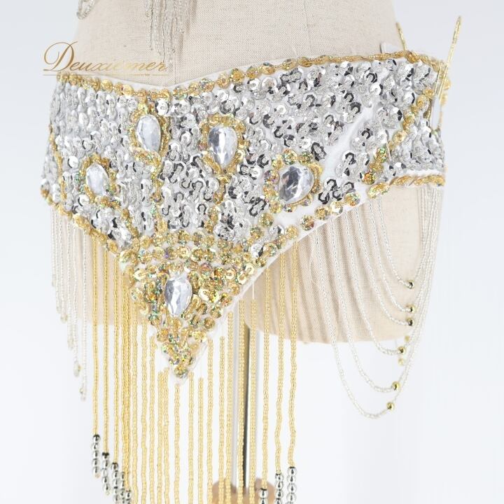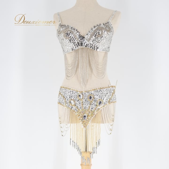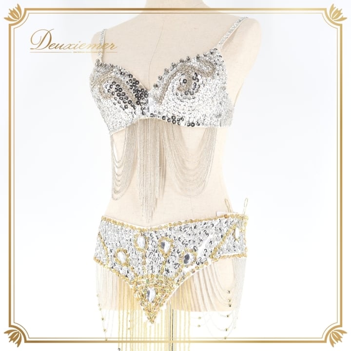 ベリーダンス オリエンタル 衣装 トップス ベルト セット ホワイト系 ビーズ スパンコール フリンジ ラインストーン キラキラ 煌びやか 金 華やか 上品 舞台 ダンス衣装 豪華 ゴージャス シルバー系 ゴールド系