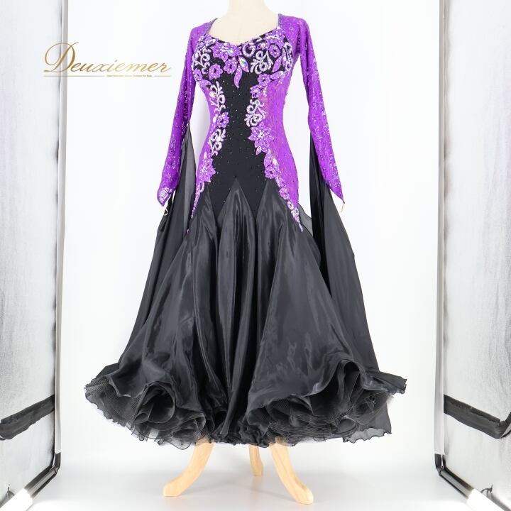 社交ダンス 衣装 チャコット Chacott スタンダード ドレス スタンダードドレス ワンピース 紫 黒 レース フロート デモ 競技 ダンス パーティ 発表会 パープル系 ブラック系 高級感 上品 フロア映え 華やか デザイン エレガント スカート重ね 着心地 日本製 ダンス衣装 おしゃれ なめらか 競技用