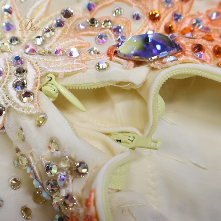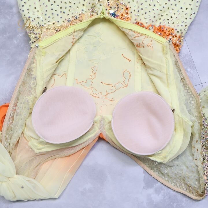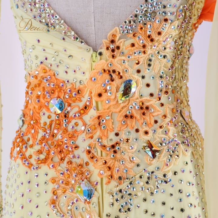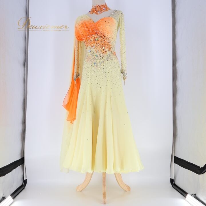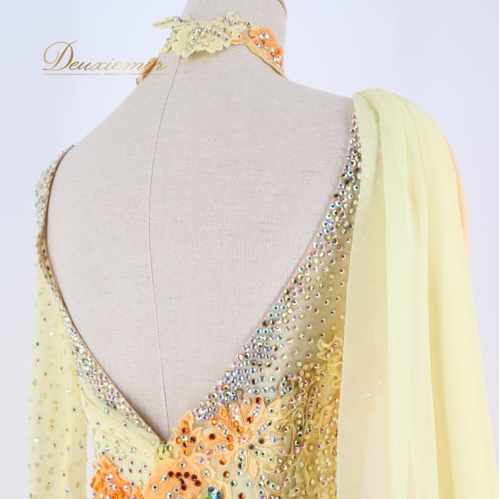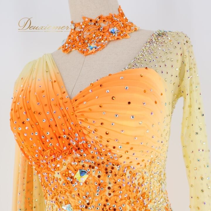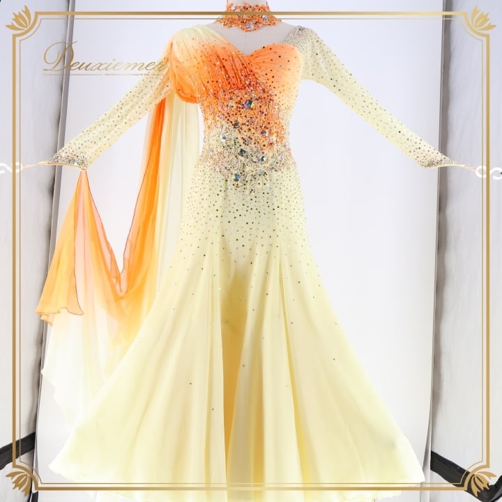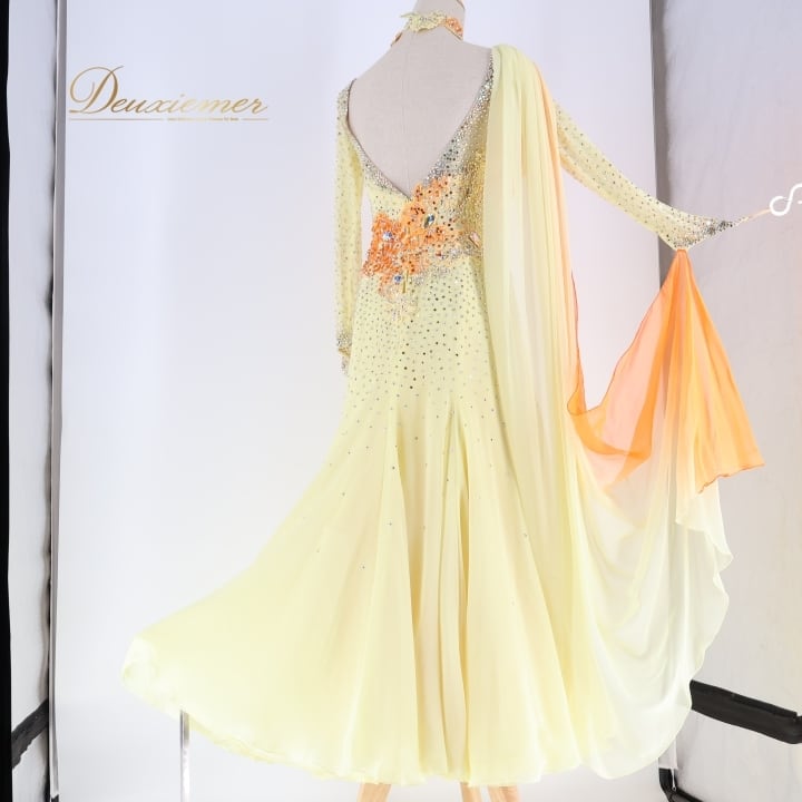 社交ダンス 衣装 スタンダードドレス ドレス スタンダード ワンピース 黄色 オレンジ デモ 競技 レース フロート 長袖 イエロー系 オレンジ系 YANAGIDA DANCEWEAR ヤナギダダンスウェア 明るい色 優しいデザイン 女性らしい フォーマルダンス 舞台衣装 フレアスカート 競技会用 ダンスイベント