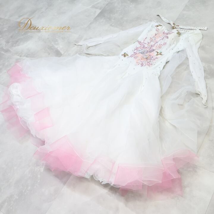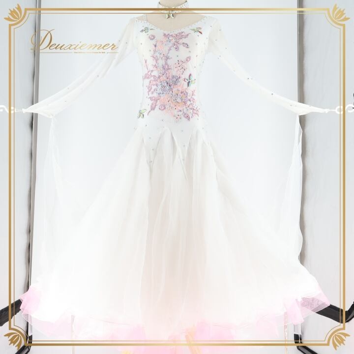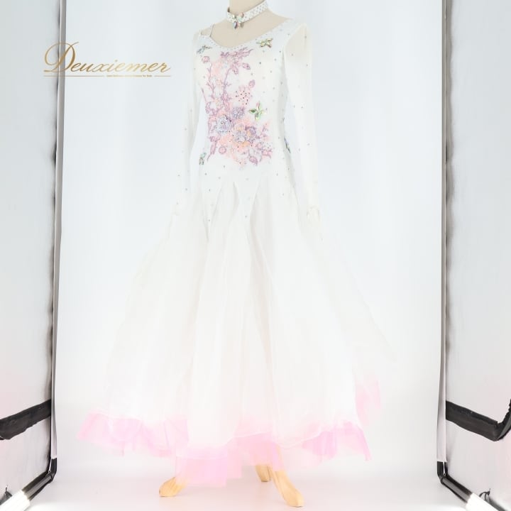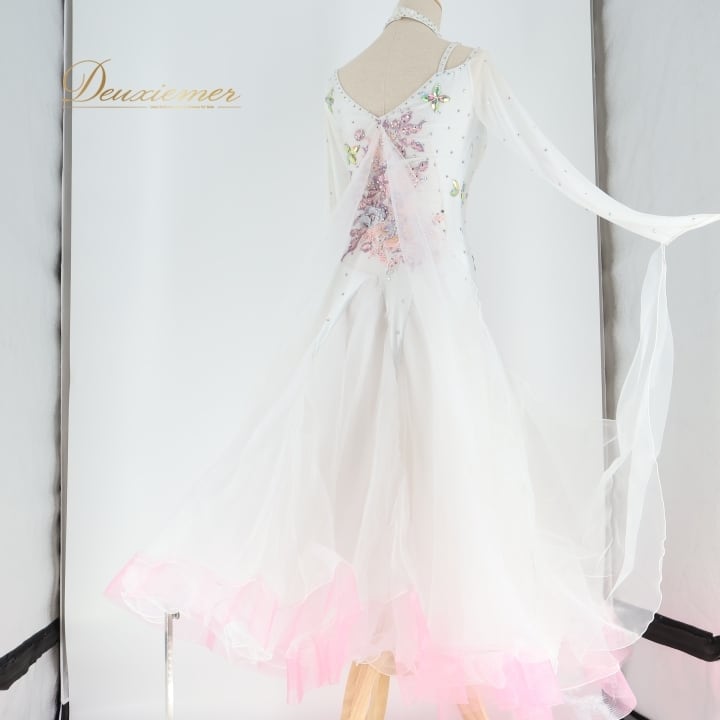 社交ダンス 衣装 スタンダード ドレス スタンダードドレス ワンピース 白 フロート デモ 競技 フリル パーティ 発表会 ピンク系 ホワイト系 フラワー おしゃれ デザイン スカート フォーマル ステージ用 Mサイズ 女性用 競技用 発表会用
