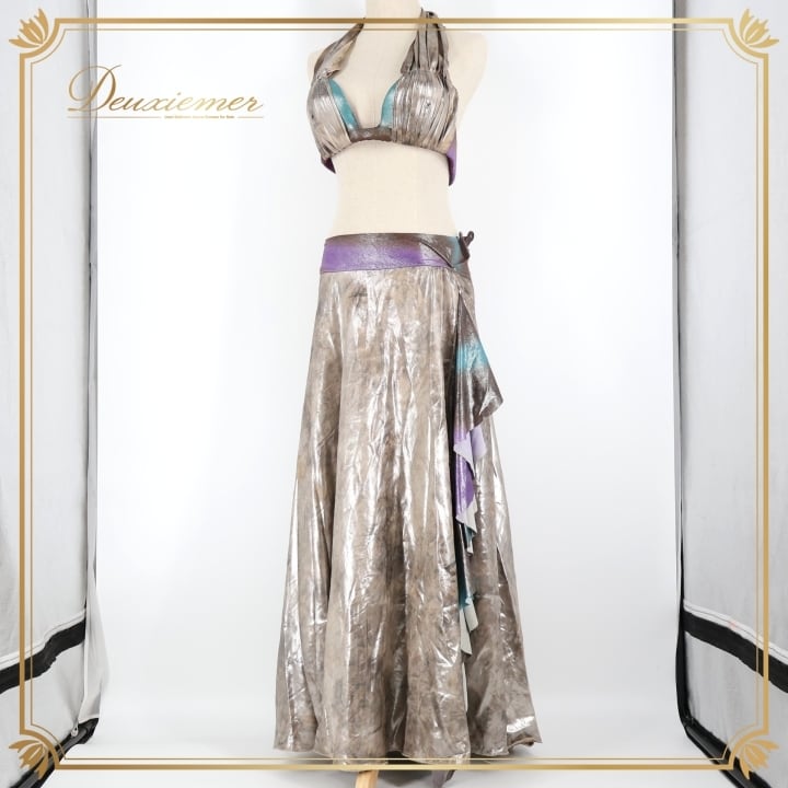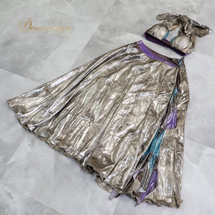 ベリーダンス オリエンタル 衣装 上下セット ゴールド系 光沢 高級感 トップス スカート フリル エジプト製 ダンス衣装 舞台 華やか 金 紫 茶 緑 シンプル キラキラ ステージ ツーピース パープル系 ブラウン系 グリーン系