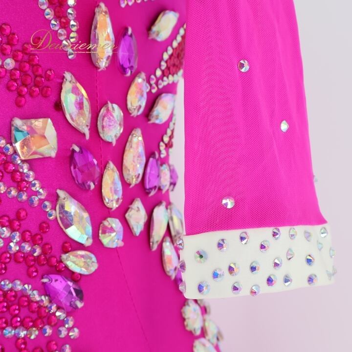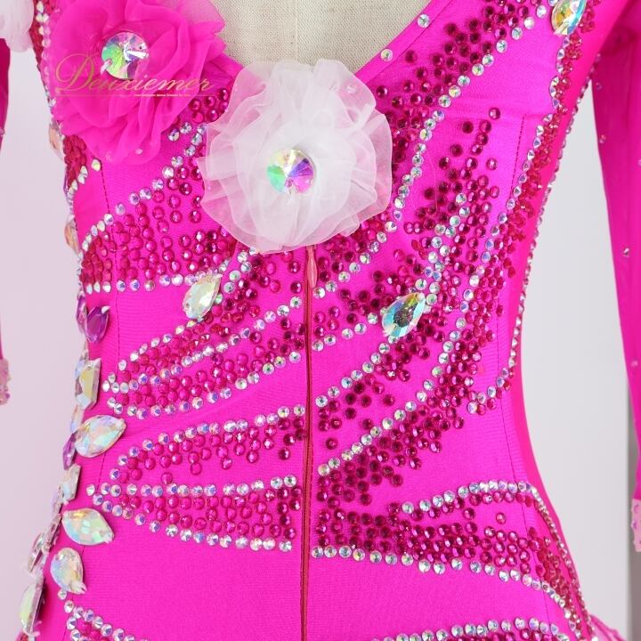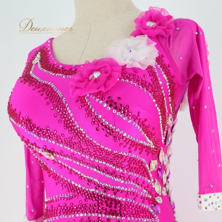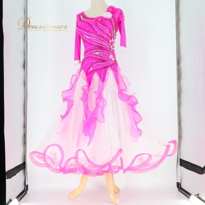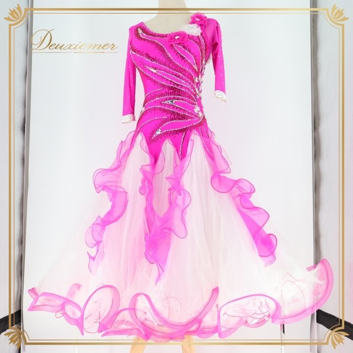 社交ダンス 衣装 スタンダード ドレス スタンダードドレス ワンピース デモ 競技 フリル レース 花 発表会 パーティ かわいい 豪華 ピンク系 ホワイト系 ビビッド ピンク キュート エレガント おしゃれ フェスティバル ダンスパフォーマンス コスチューム