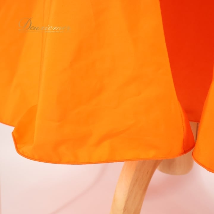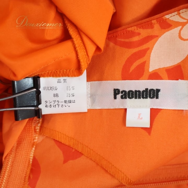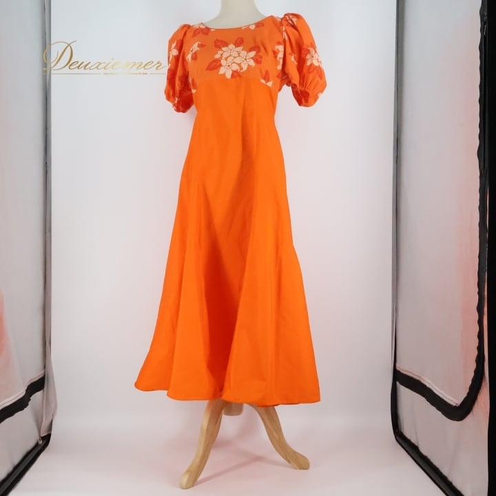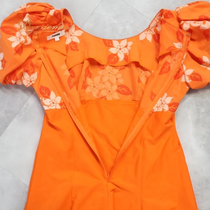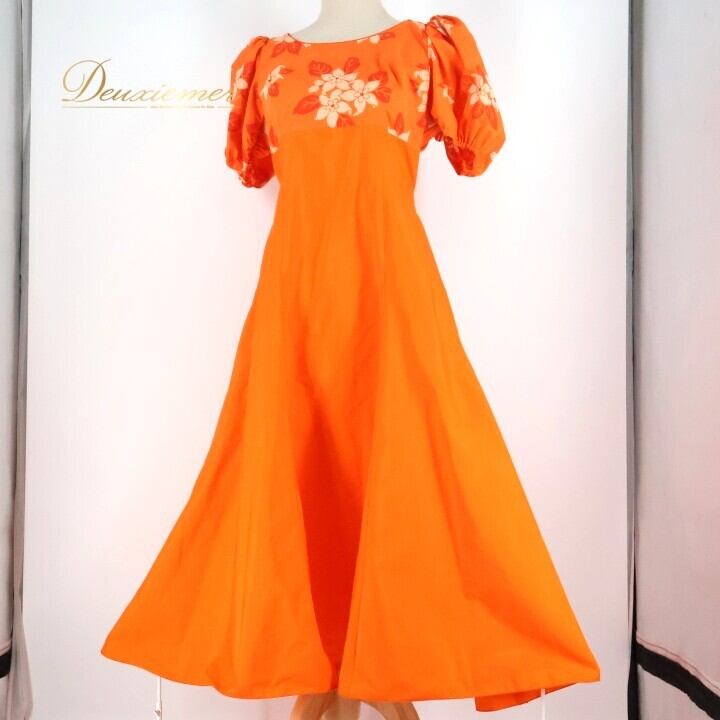 #フラダンス #衣装 #ワンピース #ドレス #日本製 #パンドール #オレンジ #パフスリーブ #可愛い #ダンス衣装 #ハワイアン #フラ文化 #女性用トルソー #サイズL #ファスナー #ポリエステル #綿 #華やか #イベント #ENUTSU