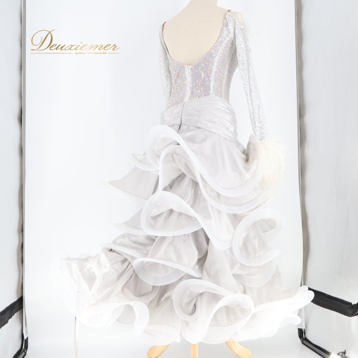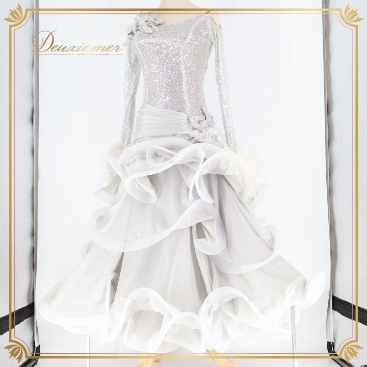 社交ダンス 衣装 ラテン スタンダード ドレス ラテンドレス ワンピース フリル デモ 競技 パーティ 発表会 シルバー系 おしゃれ フリルドレス キラキラ ダンスウェア ステージ衣装 2Way イベント用 競技用 ダンスパフォーマンス