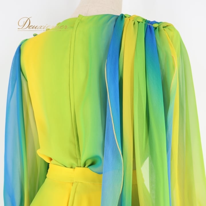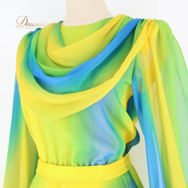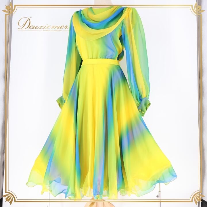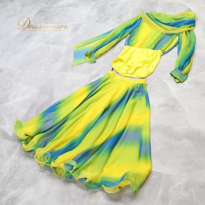 社交ダンス 衣装 チャコット Chacott ツーピース セットアップ トップス スカート 軽い グラデーション レース ミニ丈 パーティ 発表会 上下セット 透け感 グリーン系 イエロー系 日本製 軽量 おしゃれ ダンス衣装 レディース スタイリッシュ かわいい フェミニン カラフル フォーマル イベント用 大人向け