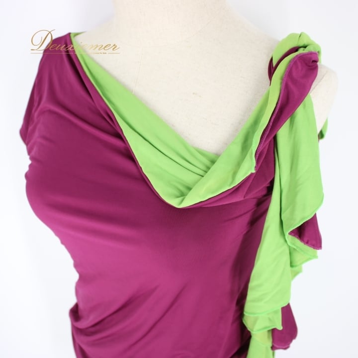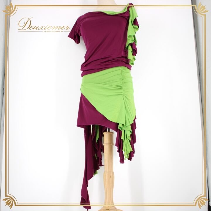社交ダンス 衣装 ラテン 上下セット ツーピース レッスンウェア パーティ衣装 オールシーズン パープル系 グリーン系 LAK creations カラフル 軽い 伸縮性あり ワンサイズ 胸パッドなし 肩パッドなし ウエストゴム仕様 スポーティ おしゃれ レディース デザイン 派手 お出かけ ダンスレッスン 発表会 フォーマル ショートスカート かわいい 楽チン プロの練習用