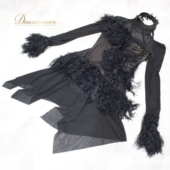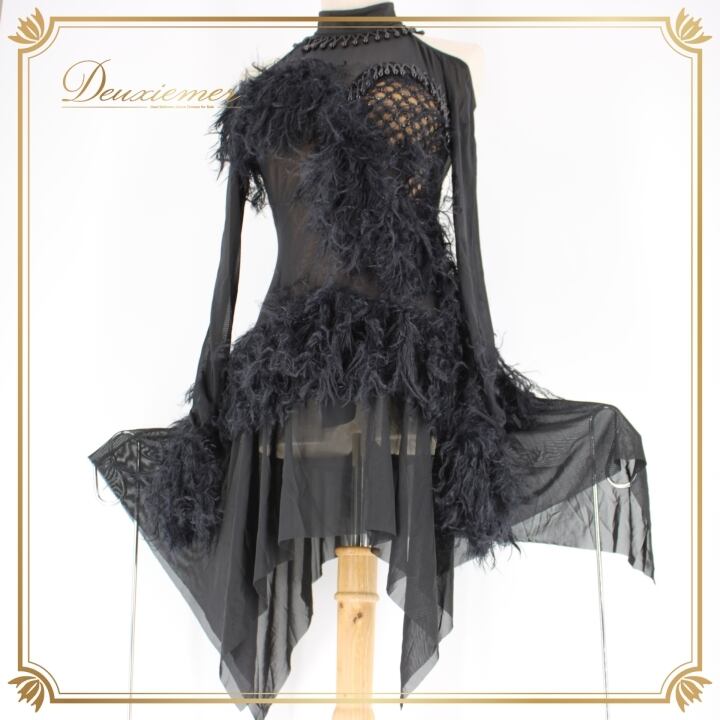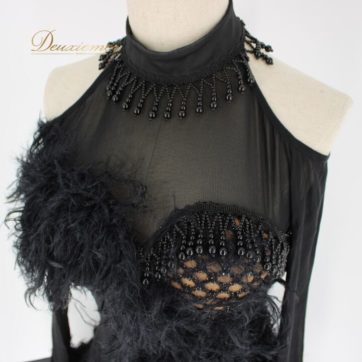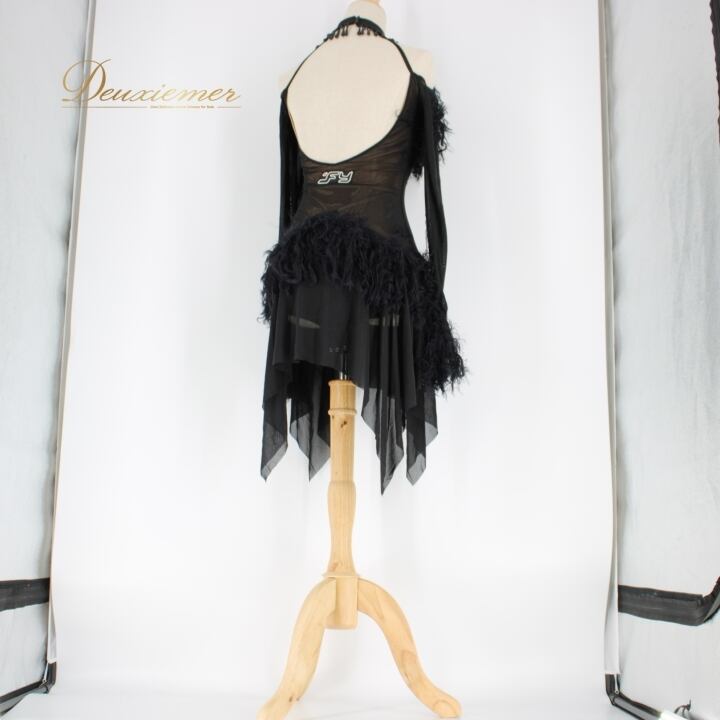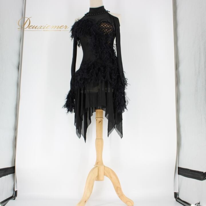 社交ダンス 衣装 ラテン ドレス ワンピース パーティ衣装 女性用 レディース オールシーズン 黒 ブラック系 アシメ 長袖 レース 派手 ビジュー ショートドレス フェザー おしゃれ エレガント ダンスウェア 結婚式 ステージ衣装 アイテム カスタマイズ可能 お揃い ジャズダンス コスチューム ファッションブランド パフォーマンス 競技用
