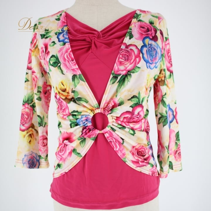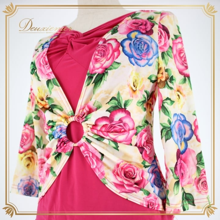 社交ダンス 衣装 スタンダード トップス レッスンウェア ICHIOKU イチオク ピンク系 フラワー柄 おしゃれ フェミニン 伸縮性 上品 華やか デザイン センターパーツ カラフル 春夏 ユニーク 用途 多様 ジャケットタイプ ショー 舞台 レディース