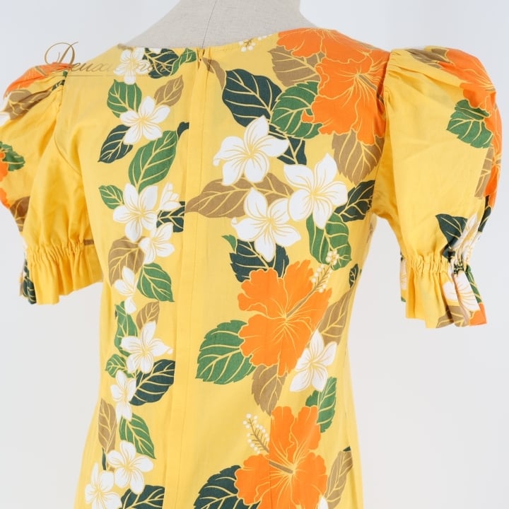 フラダンス 衣装 ワンピース ドレス イエロー系 ハイビスカス柄 リーフ柄 フリル パフスリーブ ロングワンピース オレンジ系 可愛い 華やか 鮮やか 明るい ハワイアン アロハ ハワイアンプリント フラ ダンス レッスン 練習 フラワー