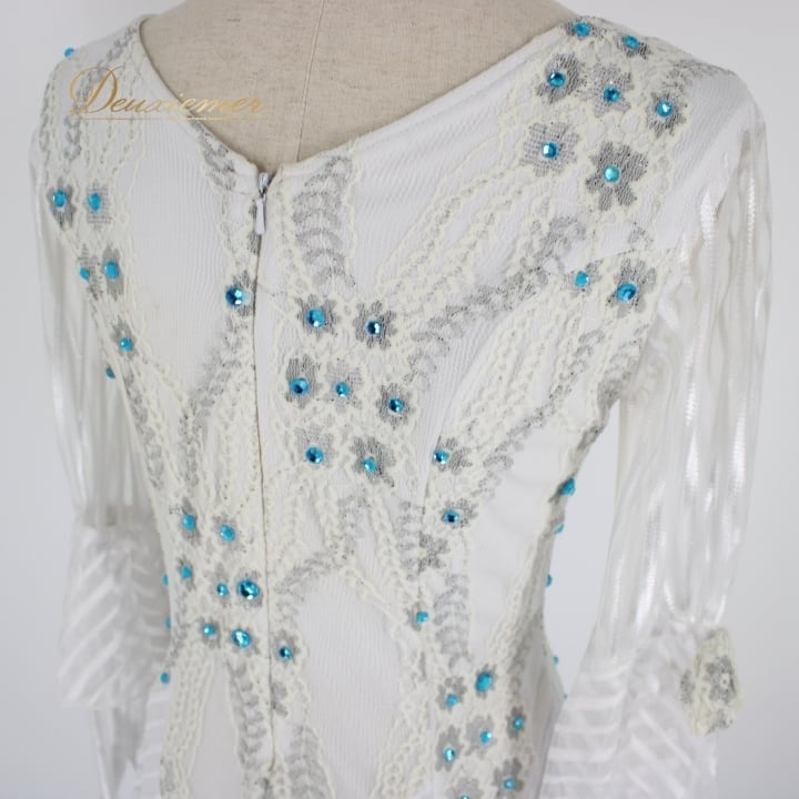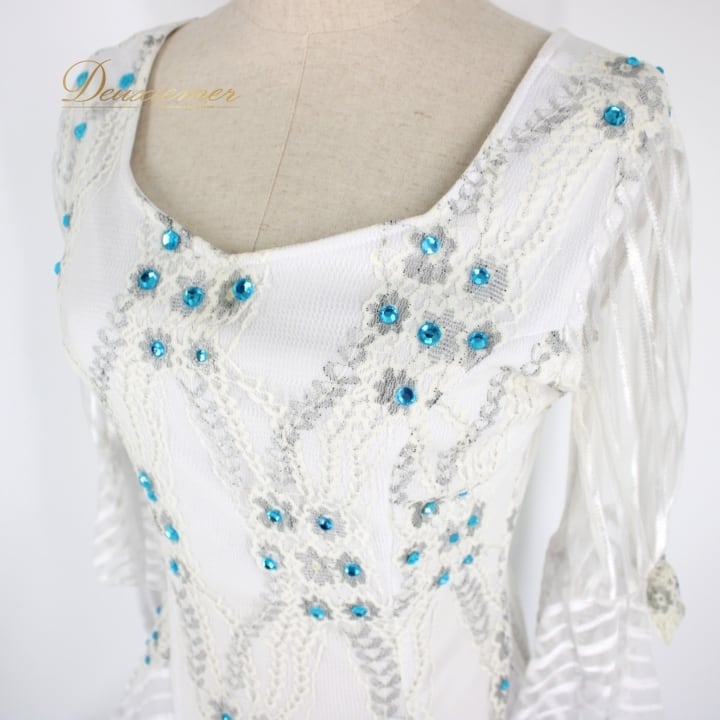 社交ダンス 衣装 スタンダード ドレス ワンピース パーティ衣装 オールシーズン solo 白 ホワイト系 ブルー系 シルバー系 ラインストーン ドレスアップ カジュアル フェミニン おしゃれ かわいい 透け感 ストレッチ 通気性 夏用 秋用 胸元デザイン 袖付き 成人式 結婚式 二次会 パーティー 舞台衣装 イベント用 ステージ衣装