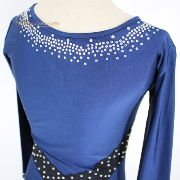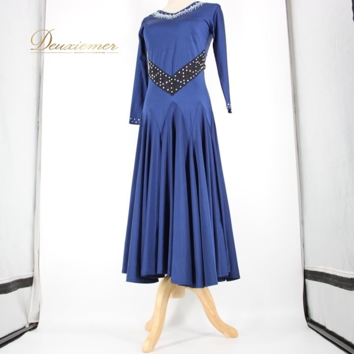 社交ダンス 衣装 スタンダード ドレス ワンピース レッスンウェア パーティ衣装 オールシーズン 青 紺 ブルー系 ネイビー系 ブラック系 長袖 深い青色 ドレッシー フラットスカート 伸縮性 優雅さ ラインストーン付き フェミニン おしゃれ コスチューム サルサ タンゴ 楽に動ける 綺麗なシルエット フォーマル 競技用 文化祭 発表会 カジュアル