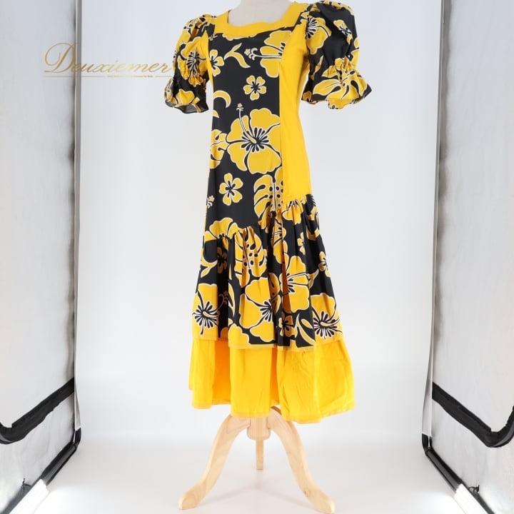 フラダンス 衣装 ワンピース ドレス Lei lani イエロー系 ハイビスカス柄 ツートーン パフスリーブ フリル ブラック系 ロングワンピース 華やか 鮮やか 派手 可愛い ハワイアン アロハ ハワイアンプリント フラ ダンス レッスン 練習