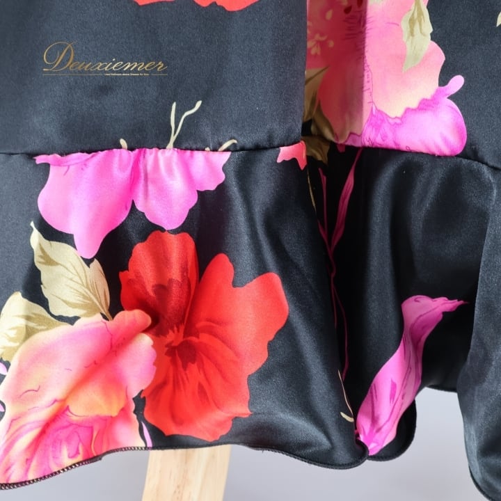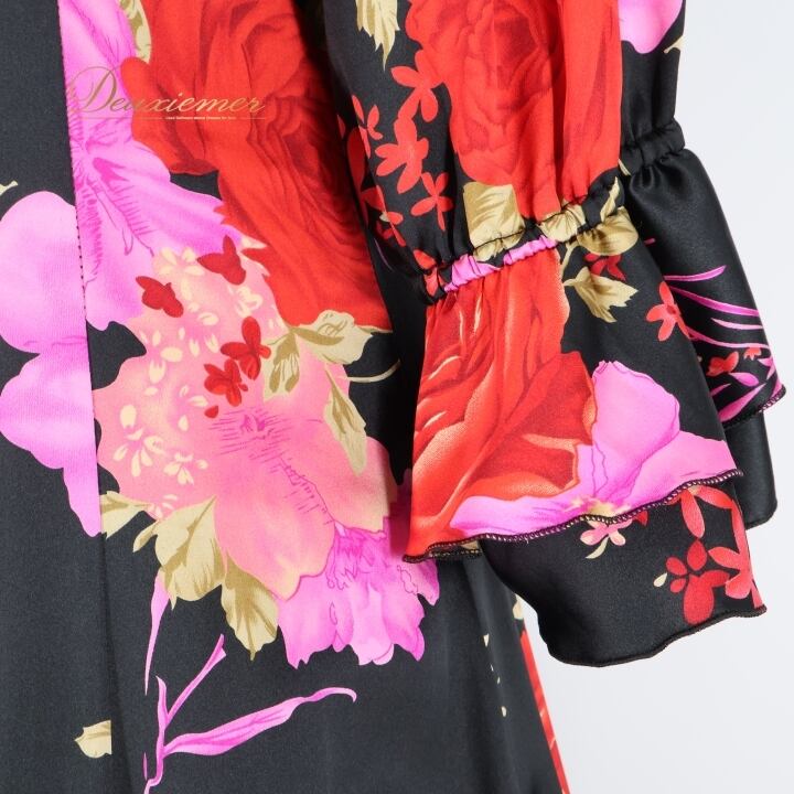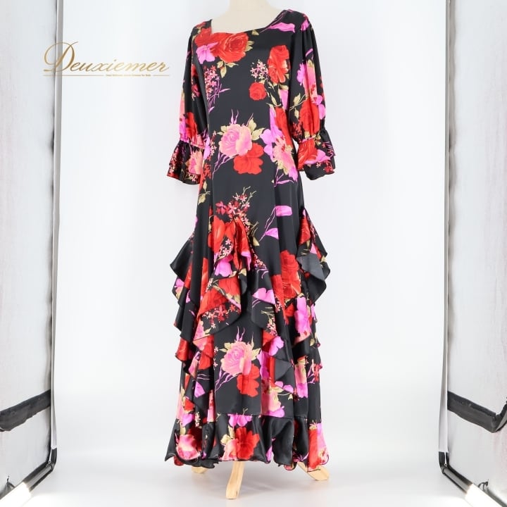 フラメンコ 衣装 ワンピース ドレス 黒 ピンク 赤 光沢 花柄 ボランテ フリル 薄い prima boutique プリマブティック ダンス パーティ 発表会 ブラック系 レッド系 ピンク系 ドレスアップ フォーマル おしゃれ 女性用 ファッション フェス ステージ