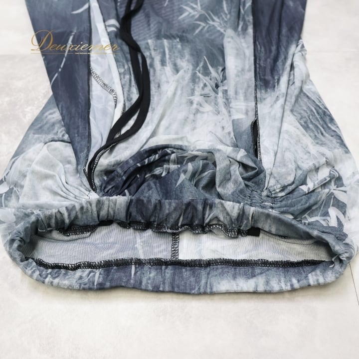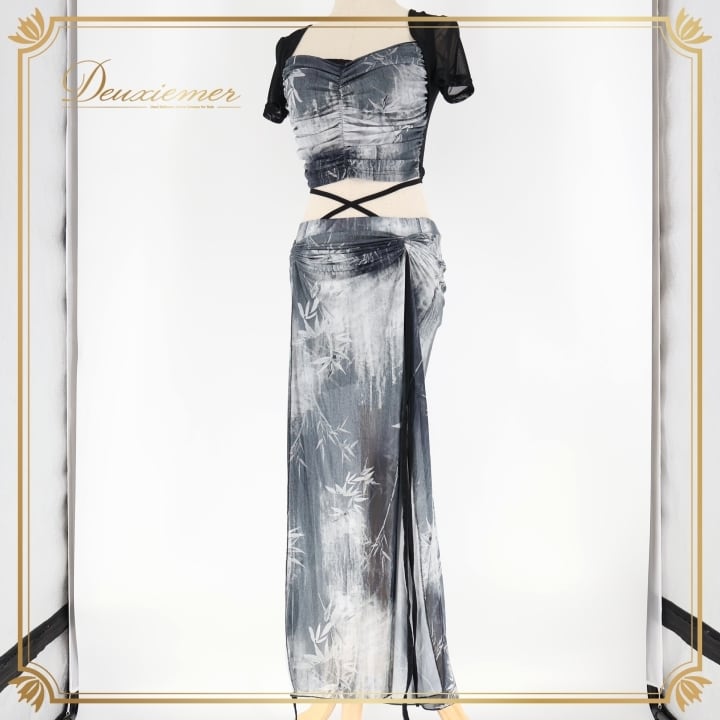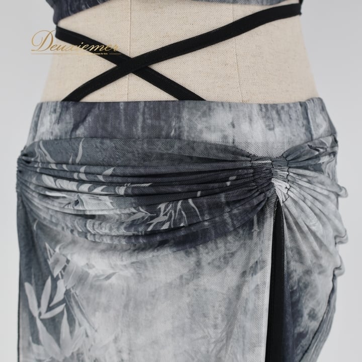 ベリーダンス 衣装 上下セット ブラック系 solana belly レッスン ストレッチ 伸縮 ツーピース セットアップ 練習 かわいい スリット インナーパンツ 葉っぱ柄 シック 柔らかい生地 半袖 落ち着いた色 グレイ系