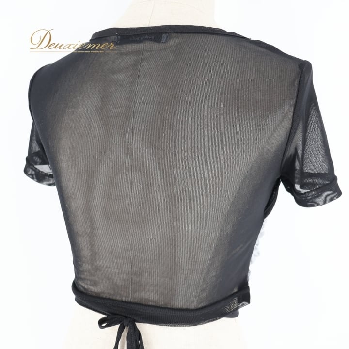 トップスのメッシュ生地に伸び有り。