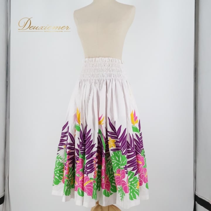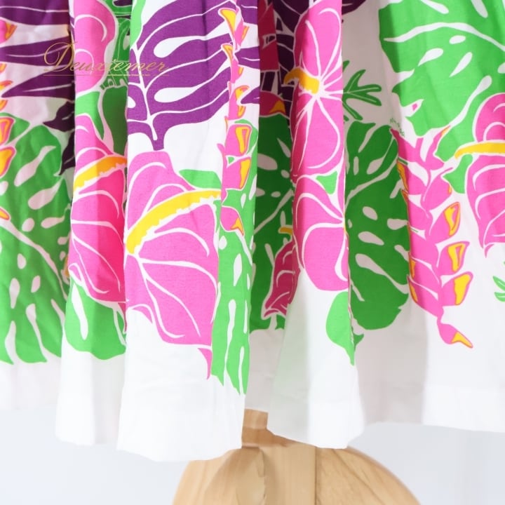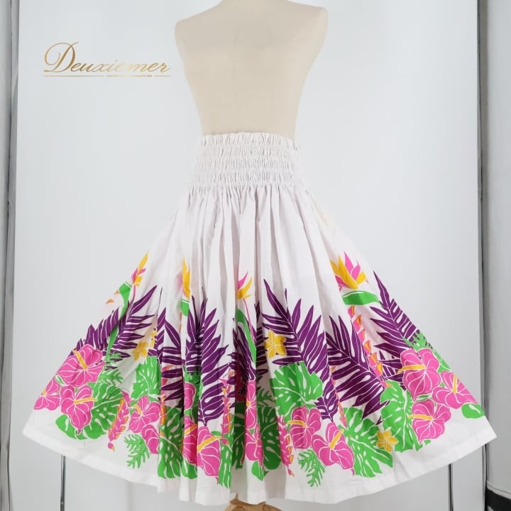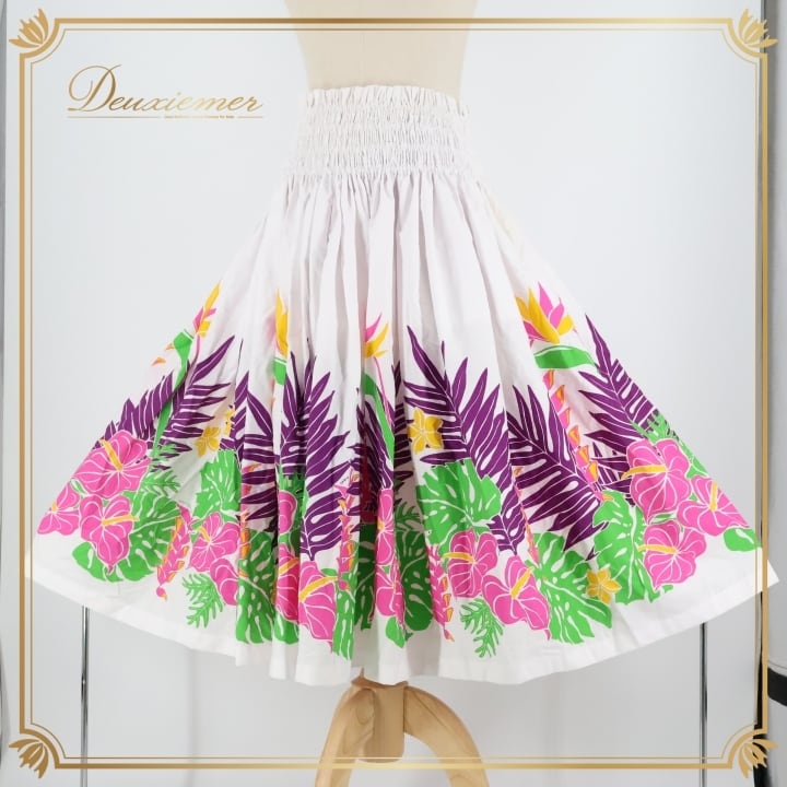 フラダンス 衣装 パウスカート エムエムジェイ ホワイト系 日本製 モンステラ柄 花柄 カラフル 鮮やか 明るい 華やか 可愛い ハワイアン アロハ ハワイアンプリント フラ ダンス レッスン 練習 パープル系 ピンク系 グリーン系