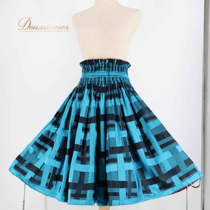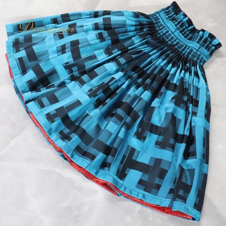 フラダンス 衣装 パウスカート ブルー系 レッド系 Hula Liko ダブル リバーシブル スカート レッスン 練習 チェック柄 華やか 鮮やか かわいい おしゃれ 大人っぽい 光沢感 高級感 ブラック系 青 水色 黒 赤 ふんわり フラ ダンス 縦型スカート リバーシブルスカート フラダンス用スカート ウエストゴムスカート 光沢生地 ハワイアン衣装 かわいいデザイン