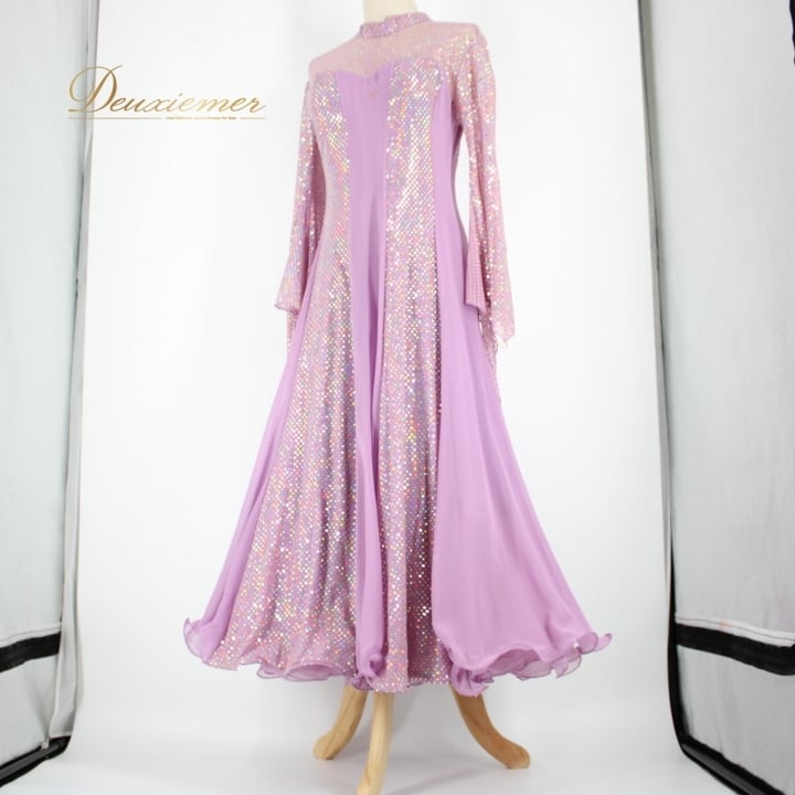 社交ダンス 衣装 スタンダード ドレス ワンピース パーティ衣装 オールシーズン 紫 パープル系 長袖 キラキラ ホログラム 派手 華やか 可愛い フレアスカート ステージ映え ダンスパフォーマンス おしゃれ トレンド かわいい ゆったりサイズ ポリエステル製 伸縮性 美しい プリンセスライン 可愛らしい ふわふわ 軽やか レディース