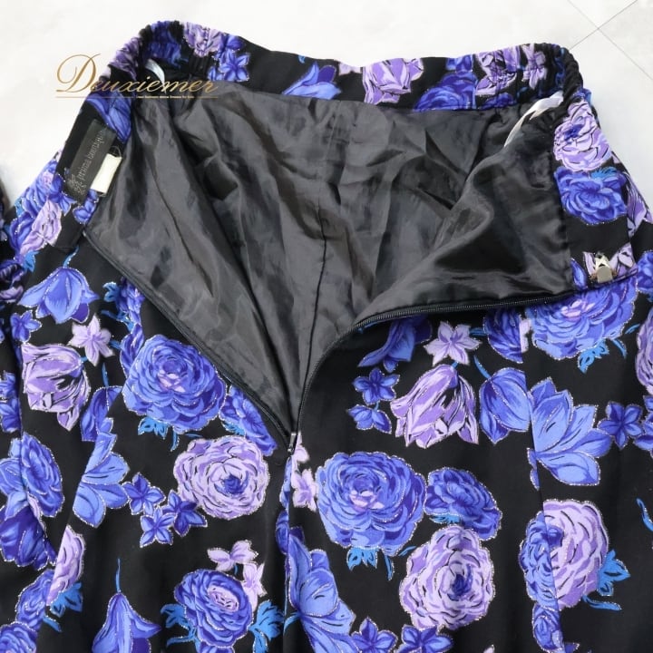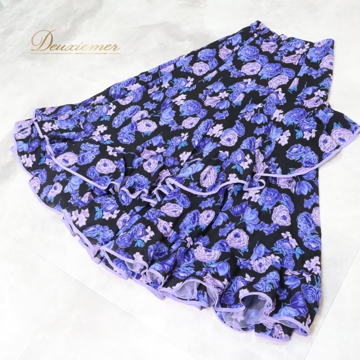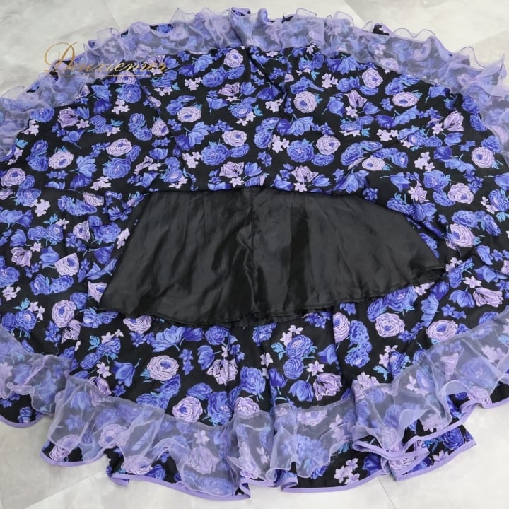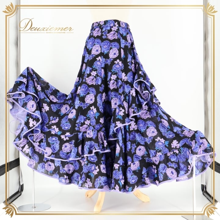 フラメンコ 衣装 ファルダ スカート 黒 紫 花柄 ラメ フリル レース ボランテ 軽い プリマブティック prima boutique ブラック系 パープル系 大人用 パーティー イベント 舞台衣装 ダンス エレガント スカート丈 フェミニン シルエット 花モチーフ フェスティバル