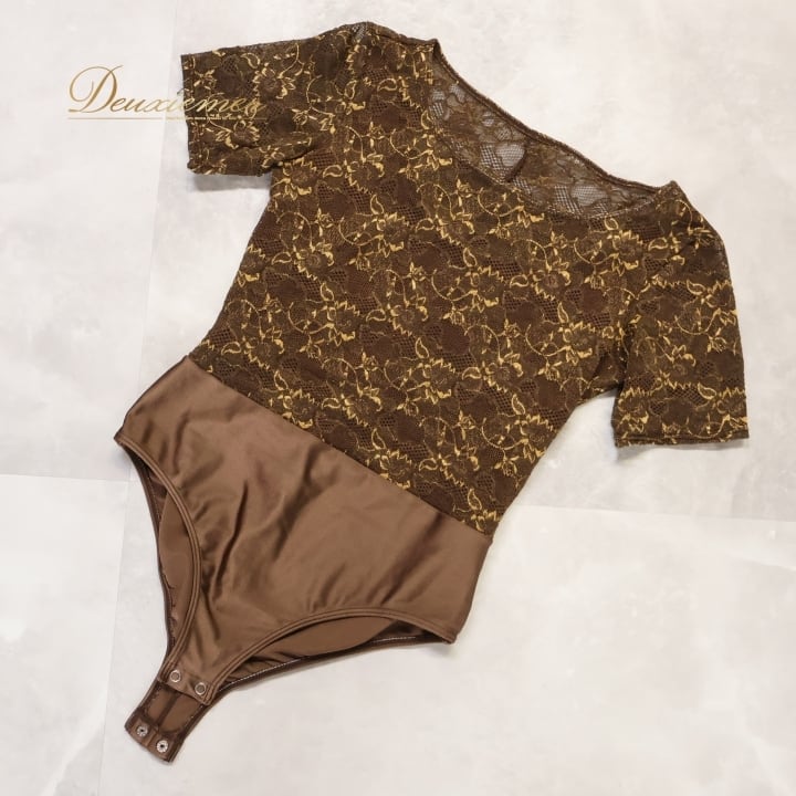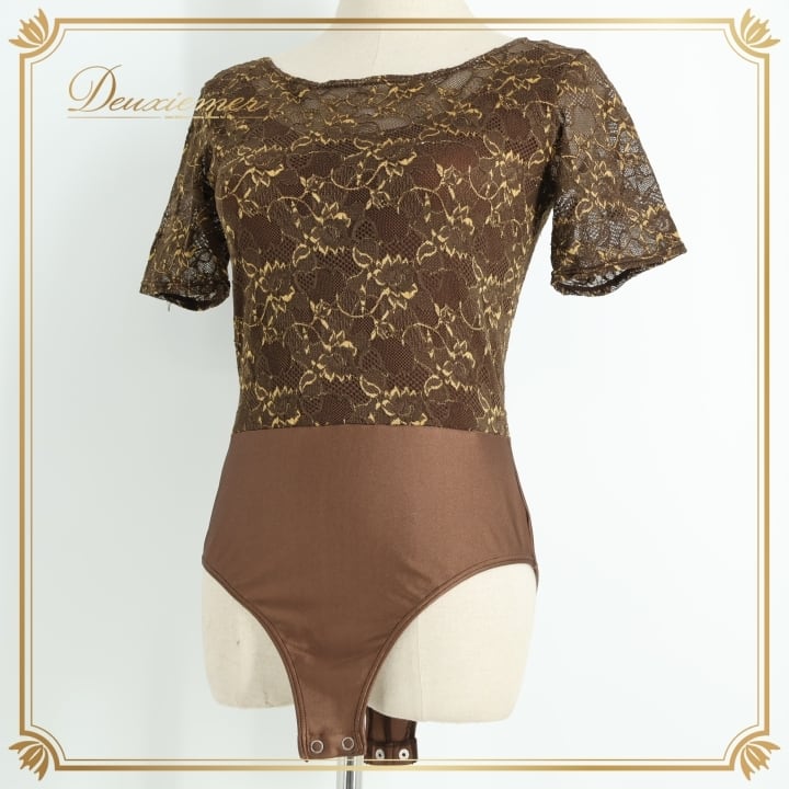 社交ダンス 衣装 レオタード ブラウン系 チャコット Chacott 花柄 レース レッスン 練習 茶 金 半袖 ストレッチ トップス 伸縮 上品 かわいい 日本製 ダンス衣装 華やか 透け感 ゴールド系