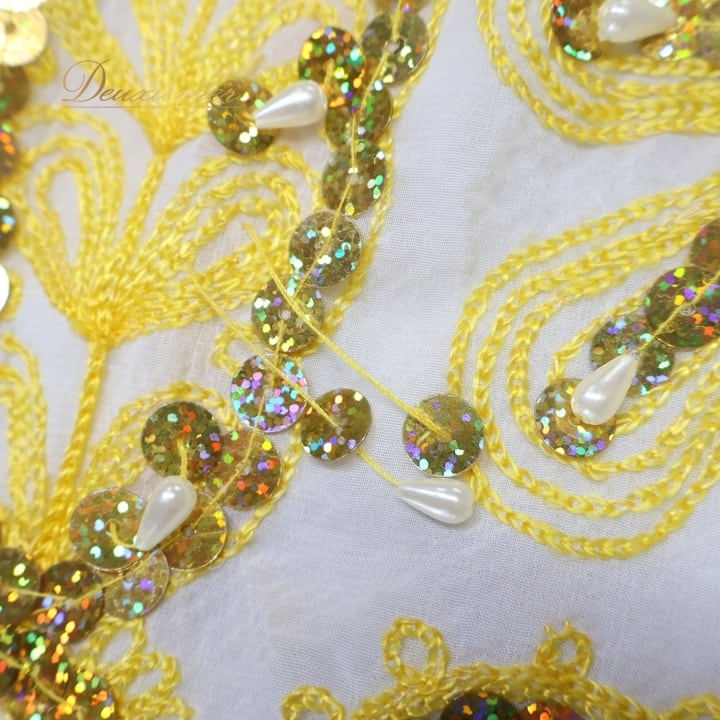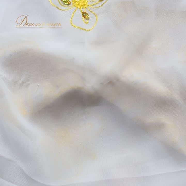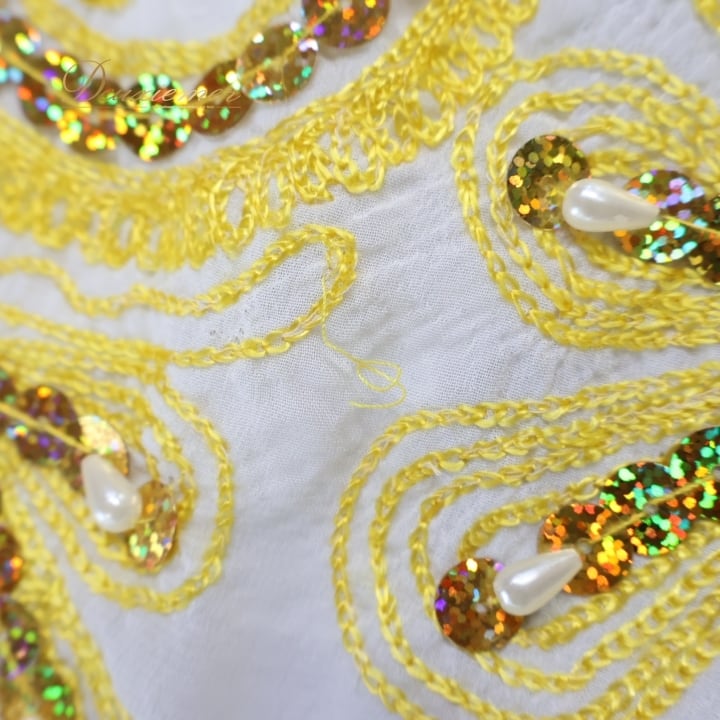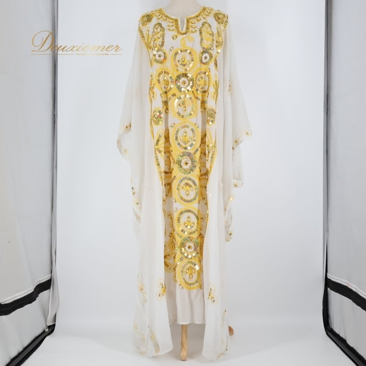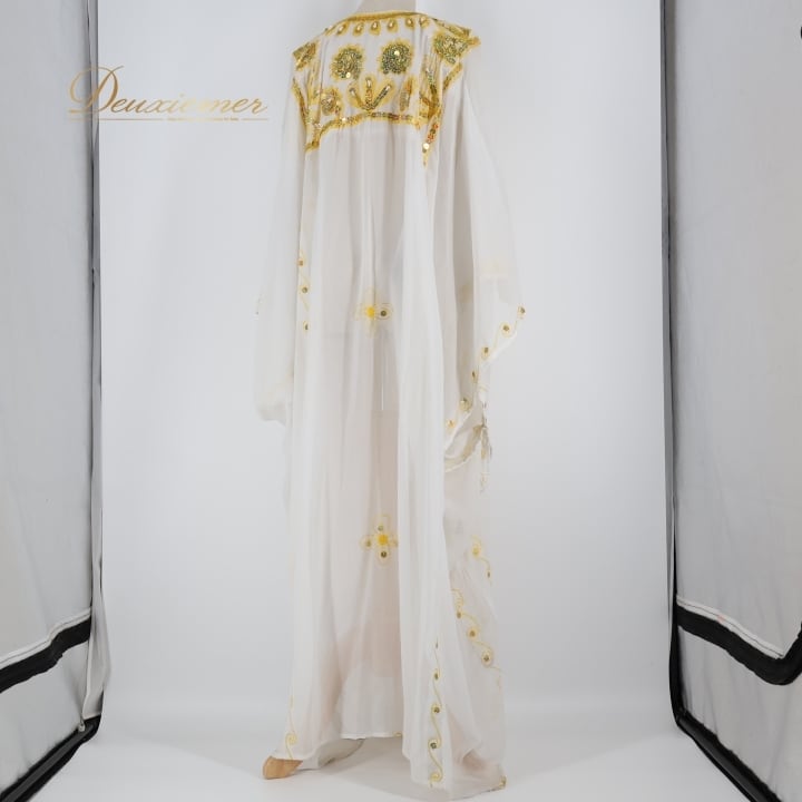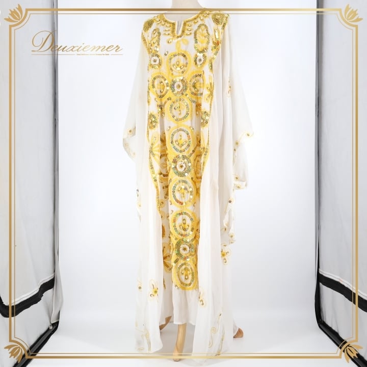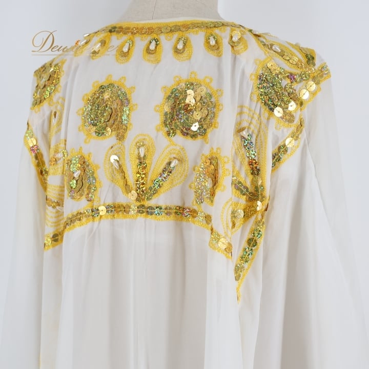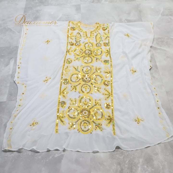 ベリーダンス 衣装 ハリージドレス ホワイト系 スパンコール ビーズ 白 黄 金 ガラベーヤ ワンピース ドレス 爽やか 羽織り 民族舞踏 ダンス衣装 刺繍 ステージ衣装 華やか 鮮やか 豪華 装飾 明るい 透け感 ゴールド系 イエロー系