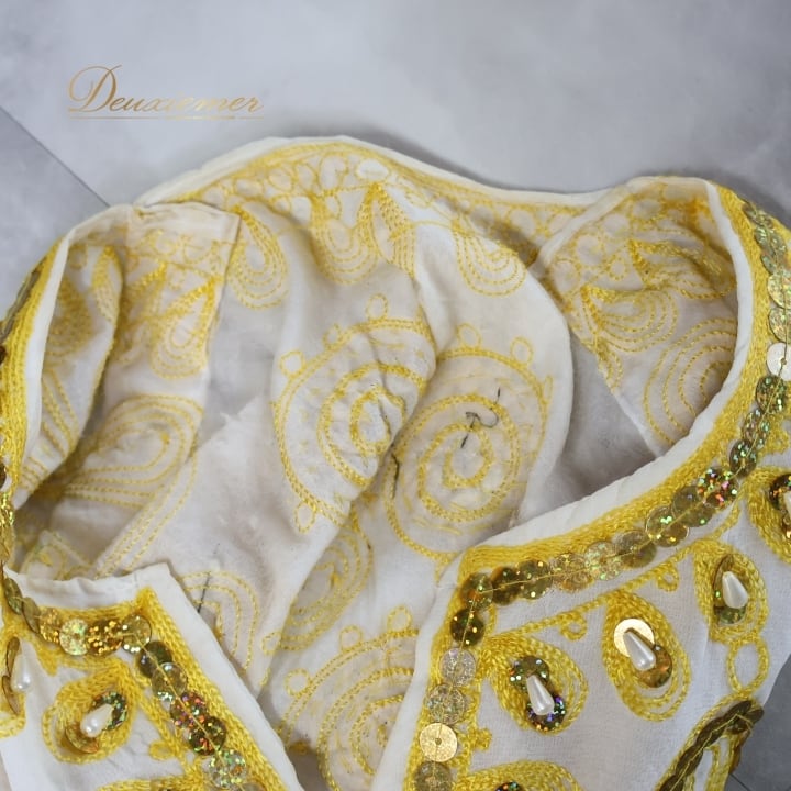 #ベリーダンス #衣装 #ハリージドレス #スパンコール #ビーズ #ダンスウェア #ホワイト #ゴールド #イエロー #華やか #パーティー #コスチューム #デザイン #トルソー #ファッション #女性用 #特別な日 #セレモニー #エンターテイメント #ENUTSU