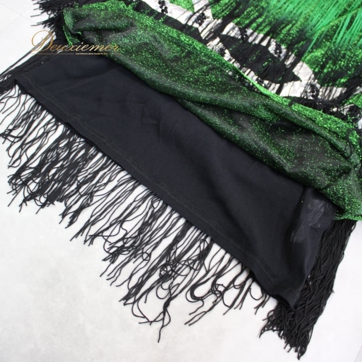 社交ダンス 衣装 ラテン ドレス ワンピース パーティ衣装 Leirena レイリーナ 黒 緑 グリーン系 ブラック系 フリンジ キラキラ 袖なし フリンジドレス ダンス衣装 ブラックグリーン スパンコール 装飾 豪華 演奏会 衣裳 おしゃれ 舞台 発表会 ジャズダンス 踊りやすい 伸縮素材 カスタムフィット ショートドレス 夜会 見せパン ひらひら