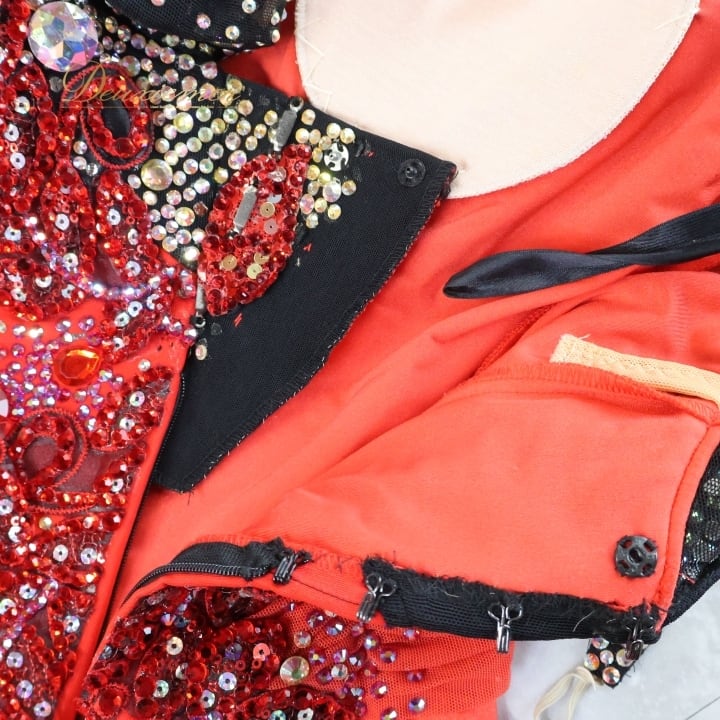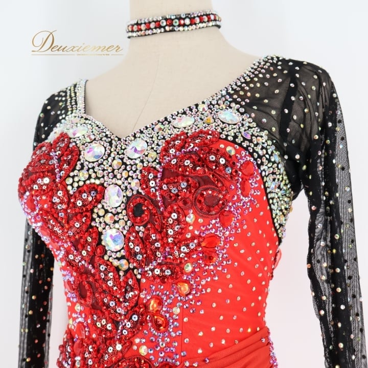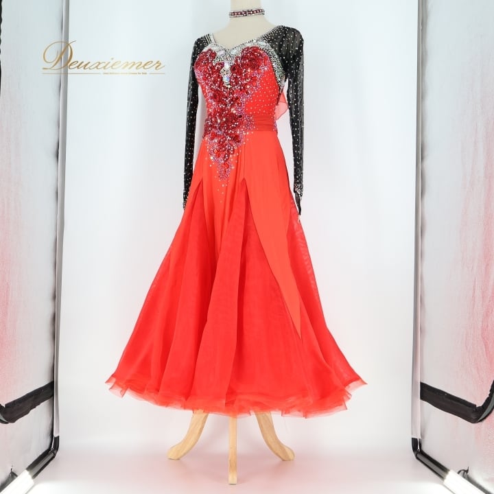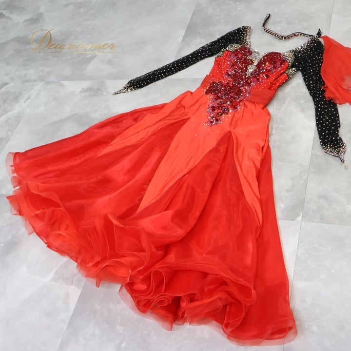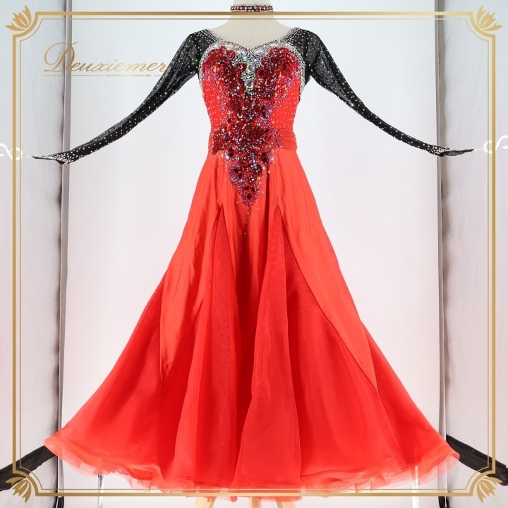 社交ダンス 衣装 スタンダード ドレス スタンダードドレス ワンピース 赤 黒 レース デモ 競技 パーティ 発表会 レッド系 ブラック系 競技用ドレス フォーマルドレス おしゃれ スカート ステージ衣装 ダンスパフォーマンス 上品 ドレスアップ 豪華 色鮮やか
