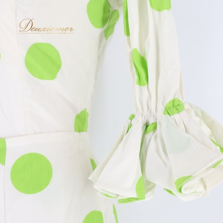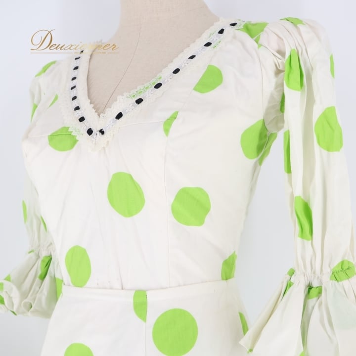 フラメンコ 衣装 ツーピース セットアップ トップス ファルダ スカート 水玉 ドット 梯子リボン レース 白 黄緑 ダンス パーティ 発表会 ホワイト系 グリーン系 フラメンコドレス かわいい スカートボリューム 明るいデザイン おしゃれ ダンス衣装 舞台衣装 ステージ衣装 女性用 ファッション