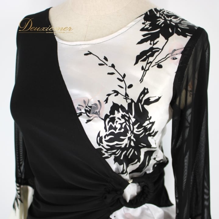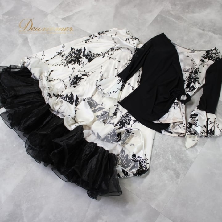 #社交ダンス #ダンス衣装 #セットアップ #バイカラー #ブラックホワイト #花柄 #大人かわいい #ふんわりスカート #ウエストゴム #伸縮性 #ポリエステル #ポリウレタン #ダンスファッション #女性用トルソー #ダンススタイル #ダンスパフォーマンス #おしゃれ #トレンド #ファッション #ENUTSU