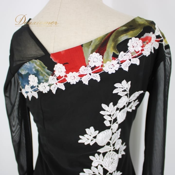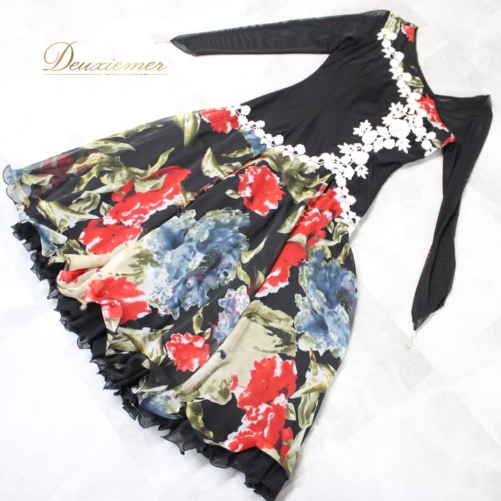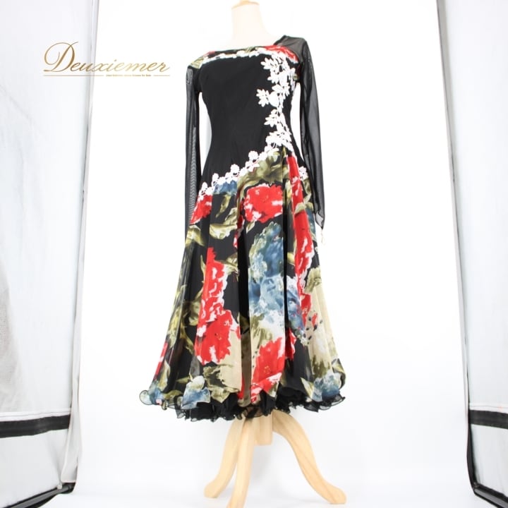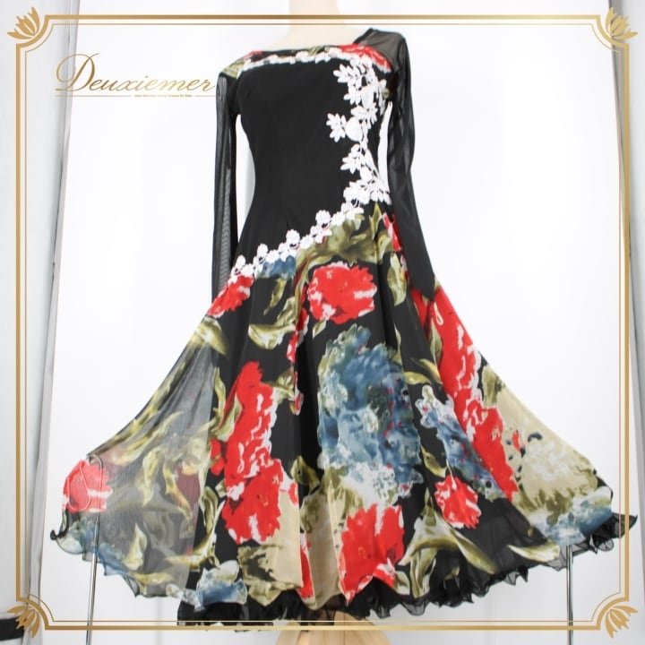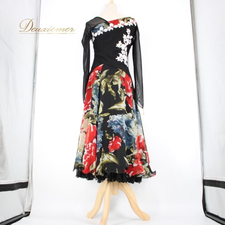 社交ダンス 衣装 スタンダード ドレス ワンピース パーティ衣装 Leirena レイリーナ 黒 赤 白 青 緑 ブラック系 ホワイト系 レッド系 フラワー柄 エレガント 柔らかい 伸縮性 ボリューム感 ハイウエスト レディース ドレスアップ 演出 舞台用 社交ダンス衣装 おしゃれ カジュアル パーティー コスチューム 体型カバー 秋冬用 上品