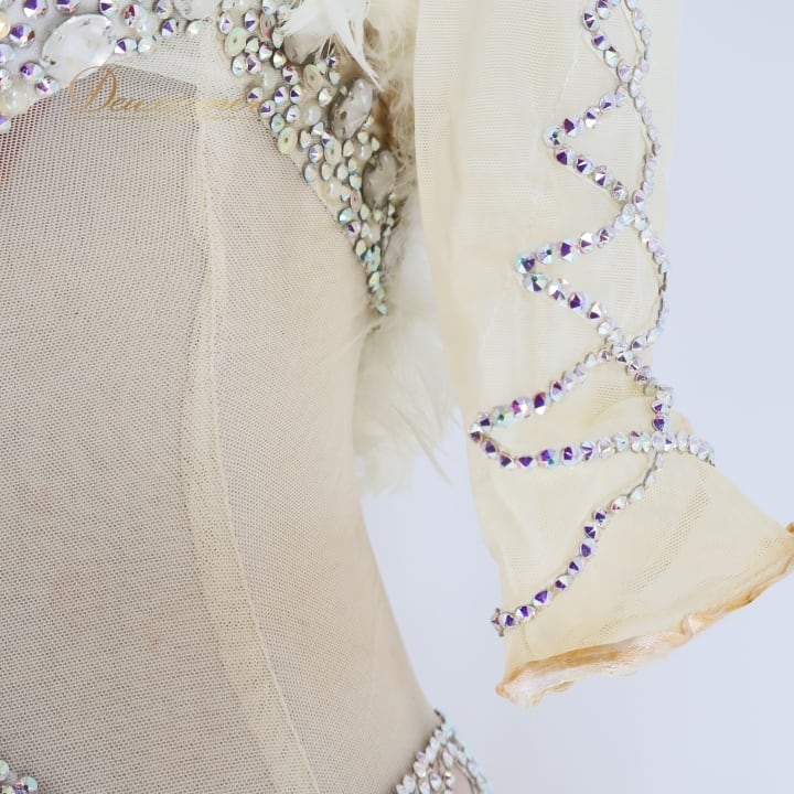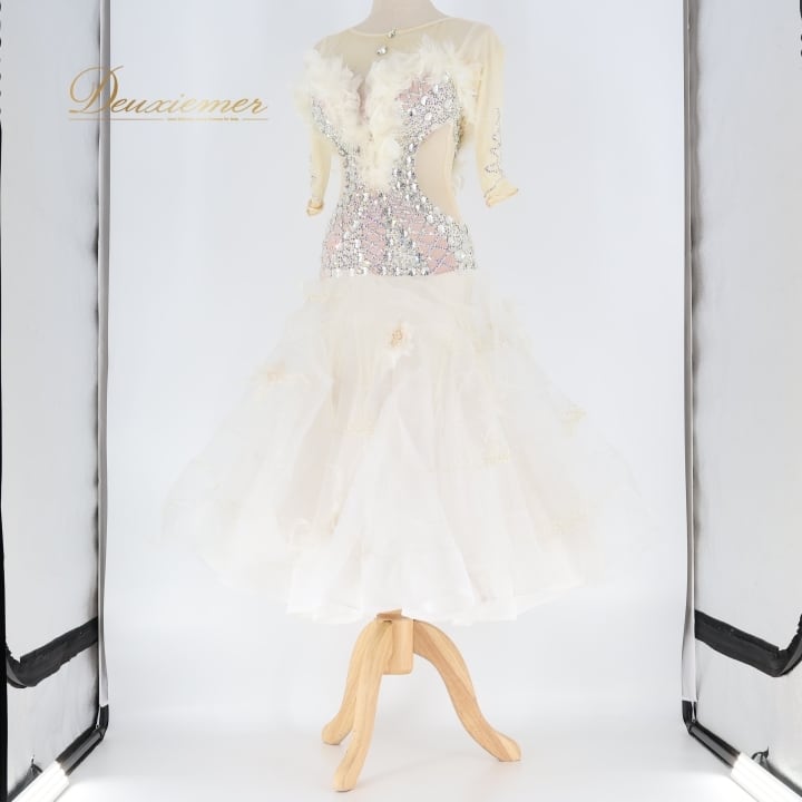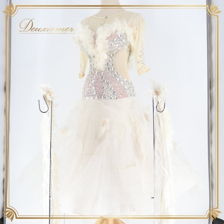 社交ダンス 衣装 The ONE スタンダード ドレス ワンピース スタンダードドレス 白 羽 綺麗 デモ 競技 ダンス パーティ 発表会 ホワイト系 フロート スカート ボリューム 豪華 エレガント フォーマル パーティードレス 発表会用 衣装 レディース