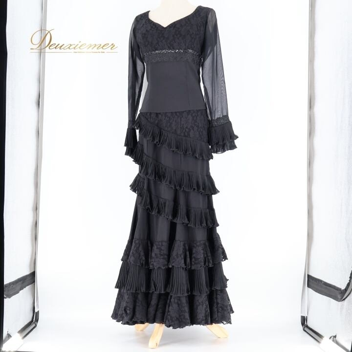 フラメンコ 衣装 ソニアジョーンズ SONIA JOHNES ツーピース セットアップ トップス ファルダ スカート 黒 レース ボランテ フリル ダンス 高級感 上品 ブラック系 フラメンコ衣装 フレアスカート 2ピース 高級デザイン シンプル エレガント オシャレ ダンスウエア 女性用 ファッション パーティ ステージ衣装 上下セット 上品系