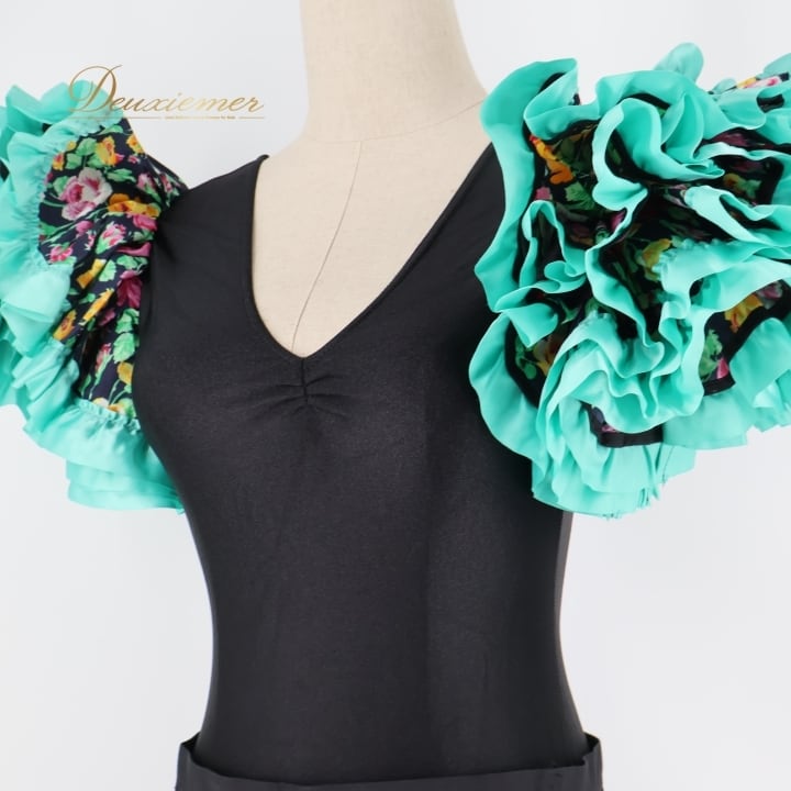 フラメンコ 衣装 ツーピース セットアップ ファルダ スカート レオタード トップス 黒 緑 ボランテ フリル ルイサ Luisa ボリューム ブラック系 グリーン系 スペイン製 フラメンコ衣装 花柄 デザイン ボリューム感 しっかりした生地感 踊り用 衣装セット