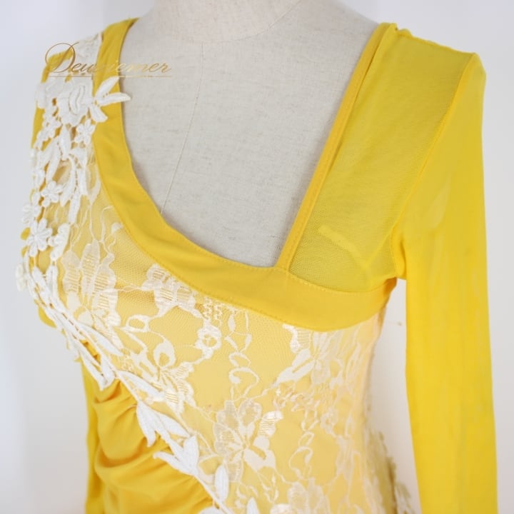 社交ダンス 衣装 スタンダード ドレス ワンピース レッスンウェア パーティ衣装 Leirena レイリーナ 黄色 白 イエロー系 ホワイト系 長袖 フェミニン レース ポリエステル ドレスアップ 誕生日 パーティー 女性用 カジュアル 体型カバー 輝く デザイン ステージ衣装 競技衣装 お洒落 コスチューム お手入れ簡単 移動簡単