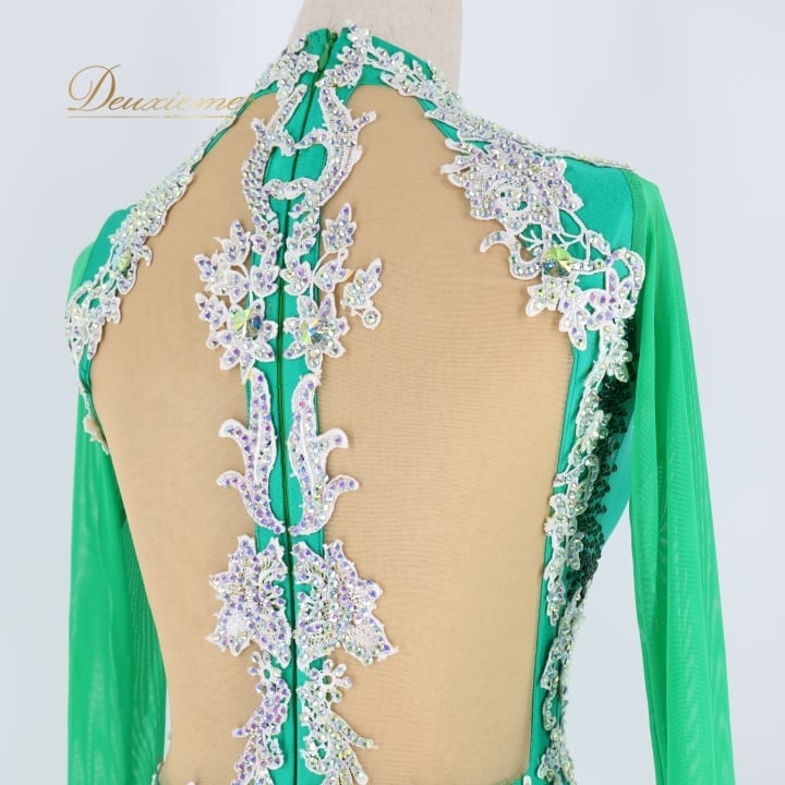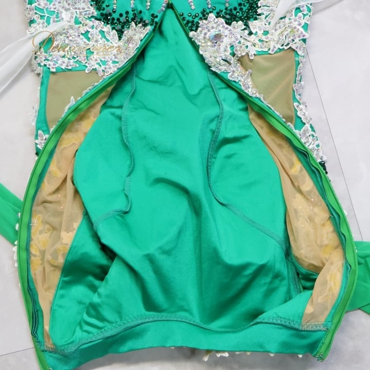 社交ダンス 衣装 スタンダード ドレス スタンダードドレス ワンピース 緑 デモ 競技 フロート レース 白 パール 高級感 上品 グリーン系 ホワイト系 ドレス おしゃれ スカート 6枚重ね 豪華 派手 大人 レディース フォーマル 大会用 競技会用 パーティー