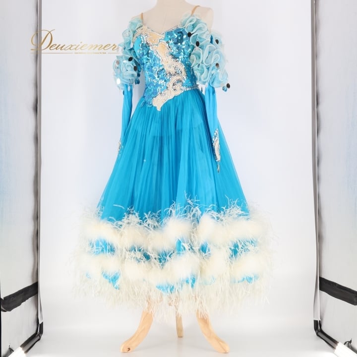 社交ダンス 衣装 スタンダード ドレス ワンピース 青 水色 ファー フリル プリーツ デモ 競技 パーティ 発表会 ブルー系 ホワイト系 鮮やか おしゃれ 豪華 スカート コスチューム 女性用 ダンス用品 競技用 イベント用 ステージ衣装 パフォーマンス用