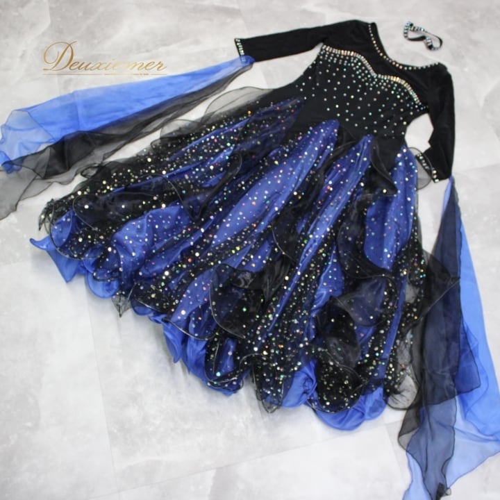 #社交ダンス #ダンス衣装 #ダンスドレス #ブルー #ブラック #二重スカート #ラインストーン #フロートデザイン #チョーカー #ファッション #ドレスコーデ #舞台衣装 #パフォーマンス #女性用 #ダンススタイル #社交ダンス衣装 #ダンスライフ #おしゃれ #コスチューム #ENUTSU