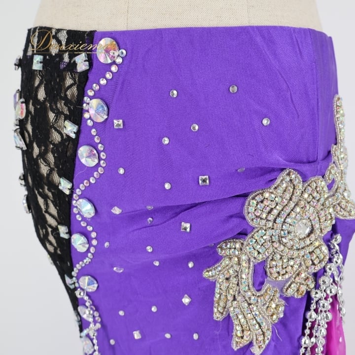 #ベリーダンス #オリエンタル衣装 #ダンス衣装 #パープル #ブラック #ラインストーン #レース #華やか #スリットスカート #ウエストゴム #トルソー #シフォン #伸縮性 #女性ファッション #ダンススタイル #パーティー衣装 #コスチューム #オシャレ #ファッション #ENUTSU