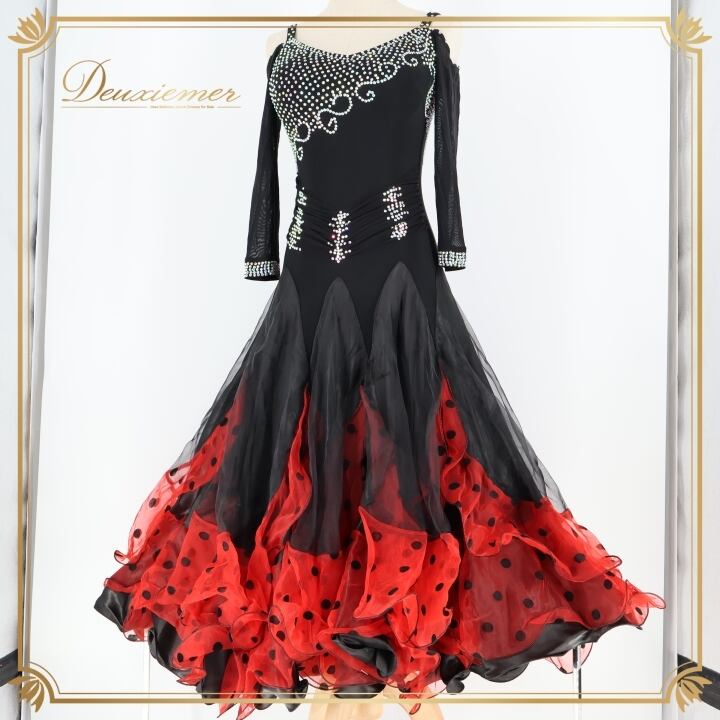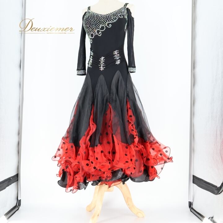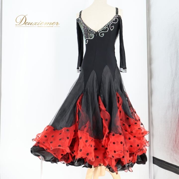 社交ダンス 衣装 ワンピース ドレス 水玉 ドット 赤 黒 フリル レース パーティ 発表会 ブラック系 レッド系 ふんわり スカート ロングドレス ジャズダンス ダンスパーティ 発表会用 ファッション フォーマル レディース おしゃれ かわいい フェミニン 上品
