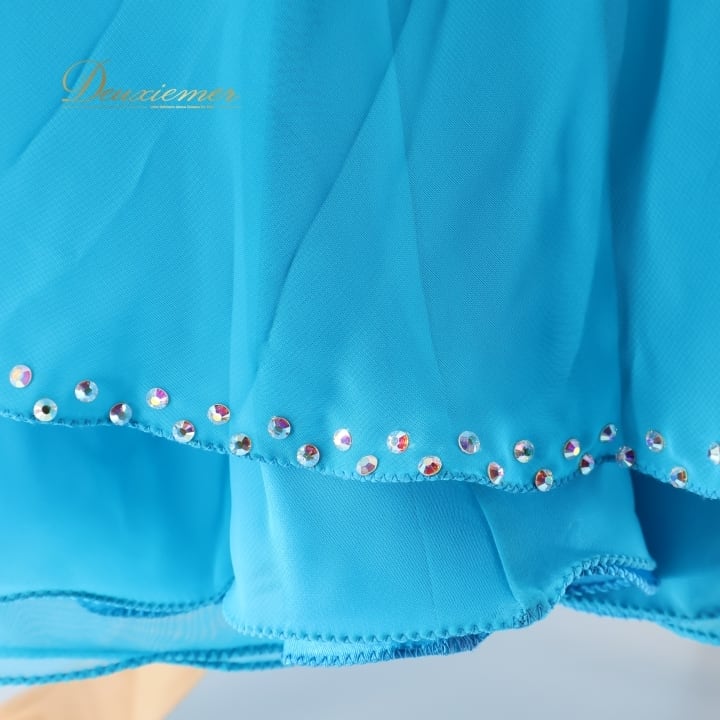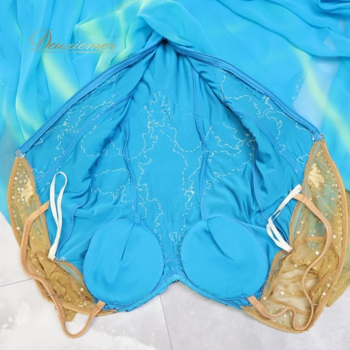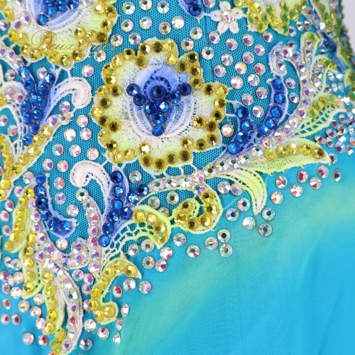 社交ダンス 衣装 白樺ドレス スタンダード ドレス ワンピース 青 フロート 水色 光沢 上品 綺麗 ダンス パーティ 発表会 デモ 競技 ブルー系 イエロー系 ドレス 美しい 上品なデザイン 華やか おしゃれ 社交ダンス衣装 競技用 発表会用 ワンピースドレス 光沢感
