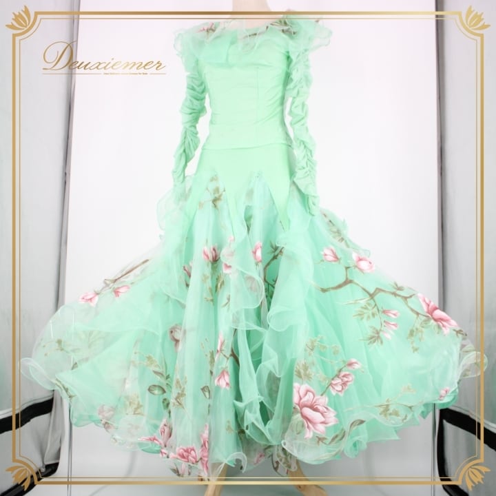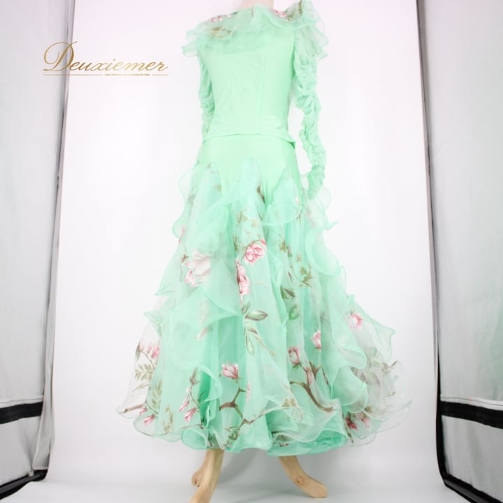#社交ダンス #ダンス衣装 #ミントグリーン #花柄デザイン #ファッション #ダンスファッション #フェミニン #スカート #トップス #ウエストゴム #伸縮性 #GRANT #優雅 #ボリューム #二重スカート #エレガント #女性用トルソー #Mサイズ #ダンスコスチューム #ENUTSU