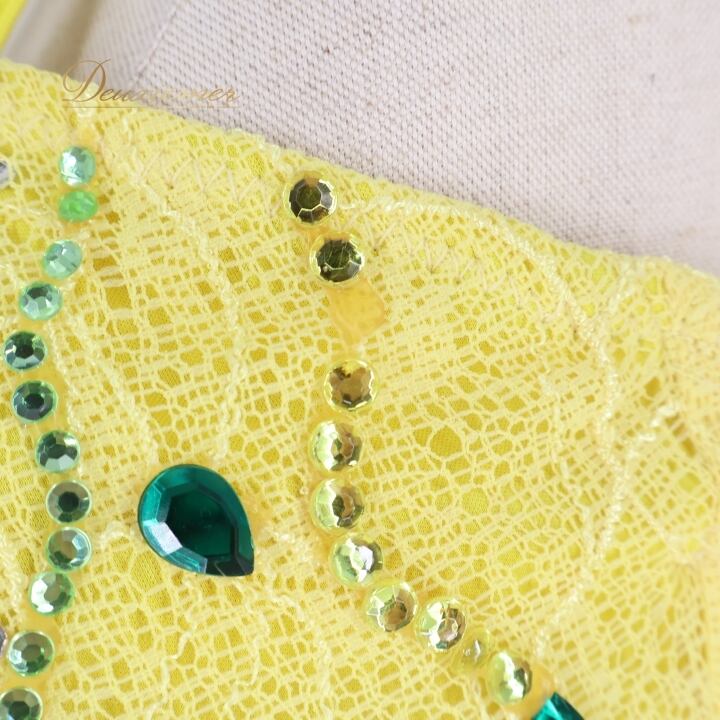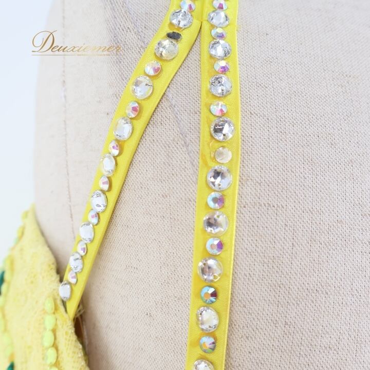 社交ダンス 衣装 スタンダード ドレス ワンピース スタンダードドレス フロート レース 黄色 デモ 競技 ダンス パーティ 発表会 つきおか 落ち感 スカート ふんわり ゆったり クラシック 上品 ダンスウェア 舞台衣装 ビジュー オシャレ かわいい