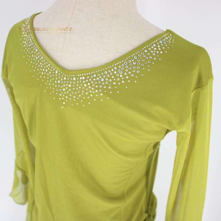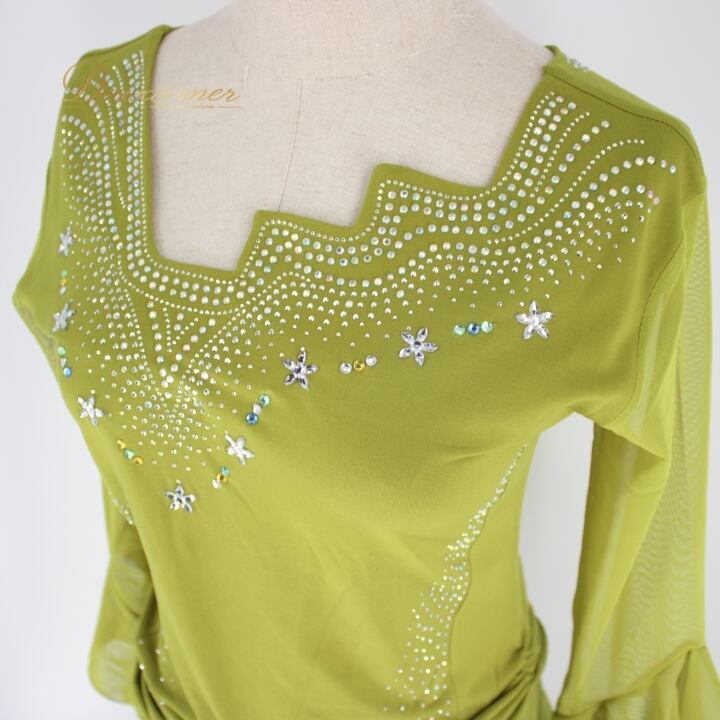 社交ダンス 衣装 スタンダード 上下セット ツーピース レッスンウェア パーティ衣装 女性用 エル・プラト 黄緑 ラインストーン シンプル 上品 伸縮性 ウエストゴム ナチュラル おしゃれ 華やか 光沢 大人 エレガント ダンス用 体形カバー 発表会 フィットネス パーティー 軽量 デイリー コーディネート モダン トレンド